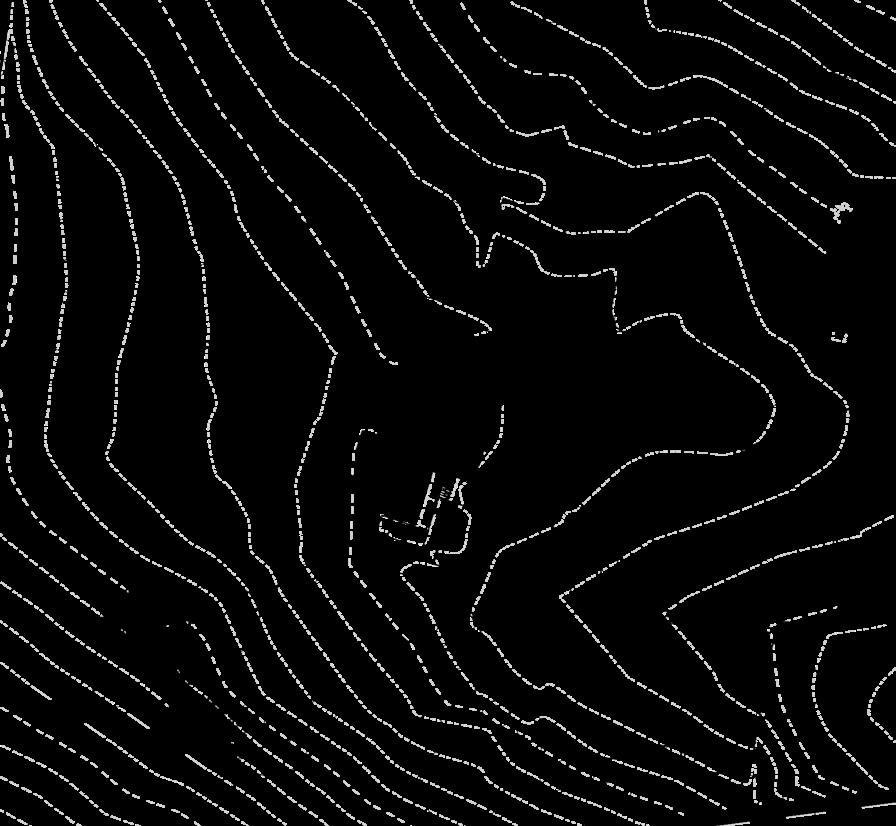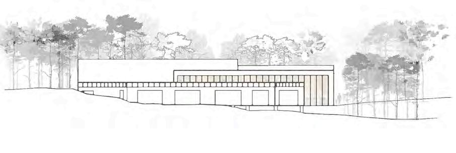 The pavilion is angled towards the existing building and parking lot. A natural path is created by the space between existing clusters of trees and other vegetation.