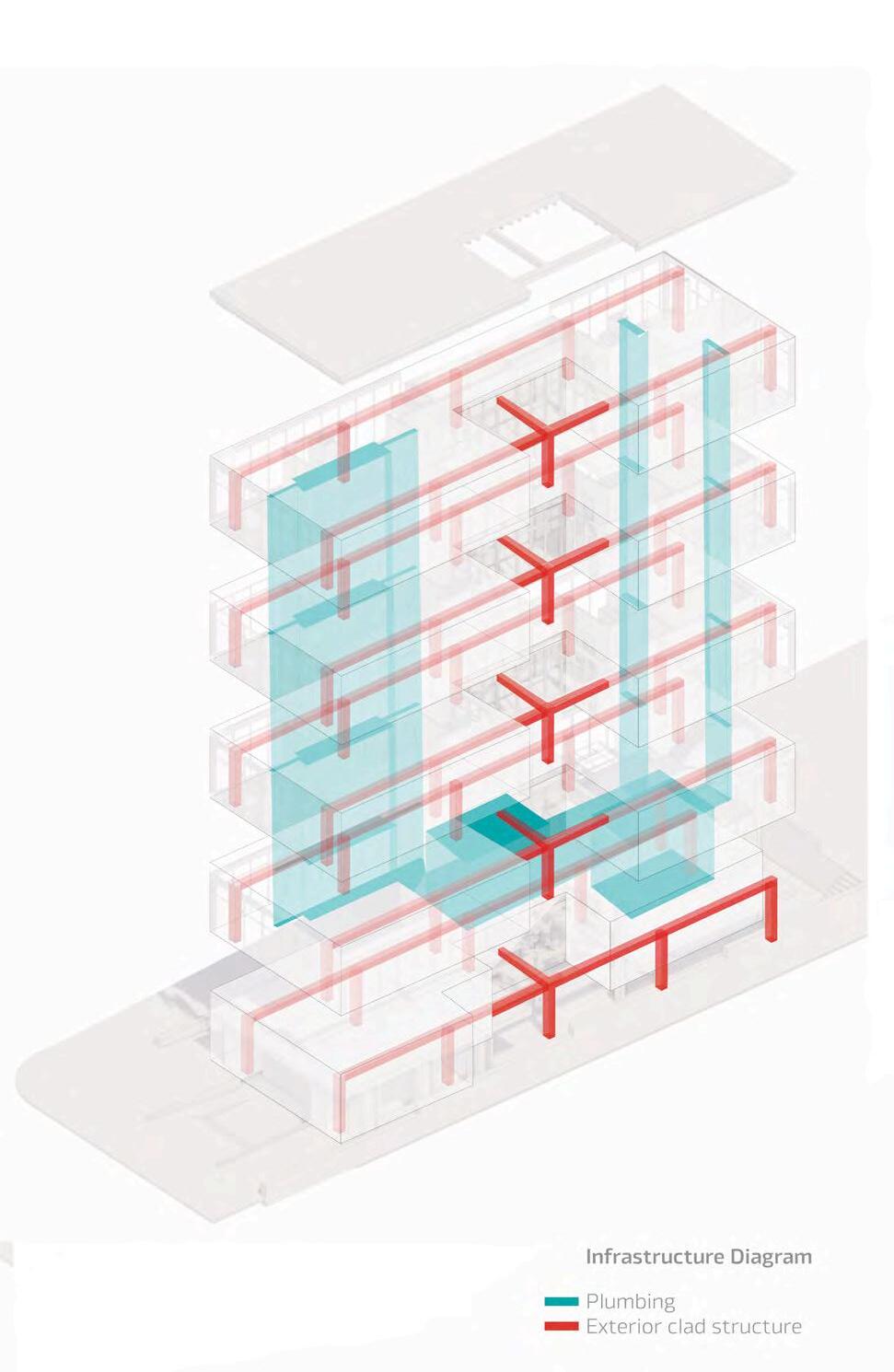 The severity of the solid massing is exaggerated the vast emptiness of the space surrounding it. The new system breaks apart the clusters into standalone buildings - those are separated into shell and core.