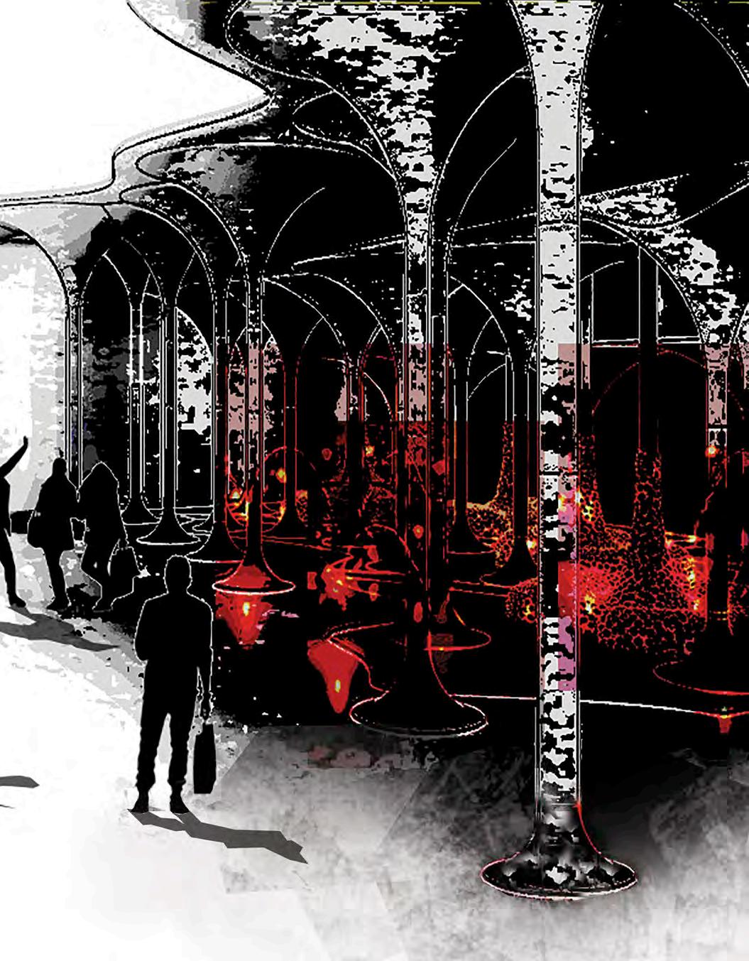 The new core and shell system allows vehicles a short glimpse of the interior. The pedestrian is forced to exit their vehicle to fully grasp the contents of a building. At night the light from within creates a lantern-effect signaling which establishments are open and pointing out entry points to them.