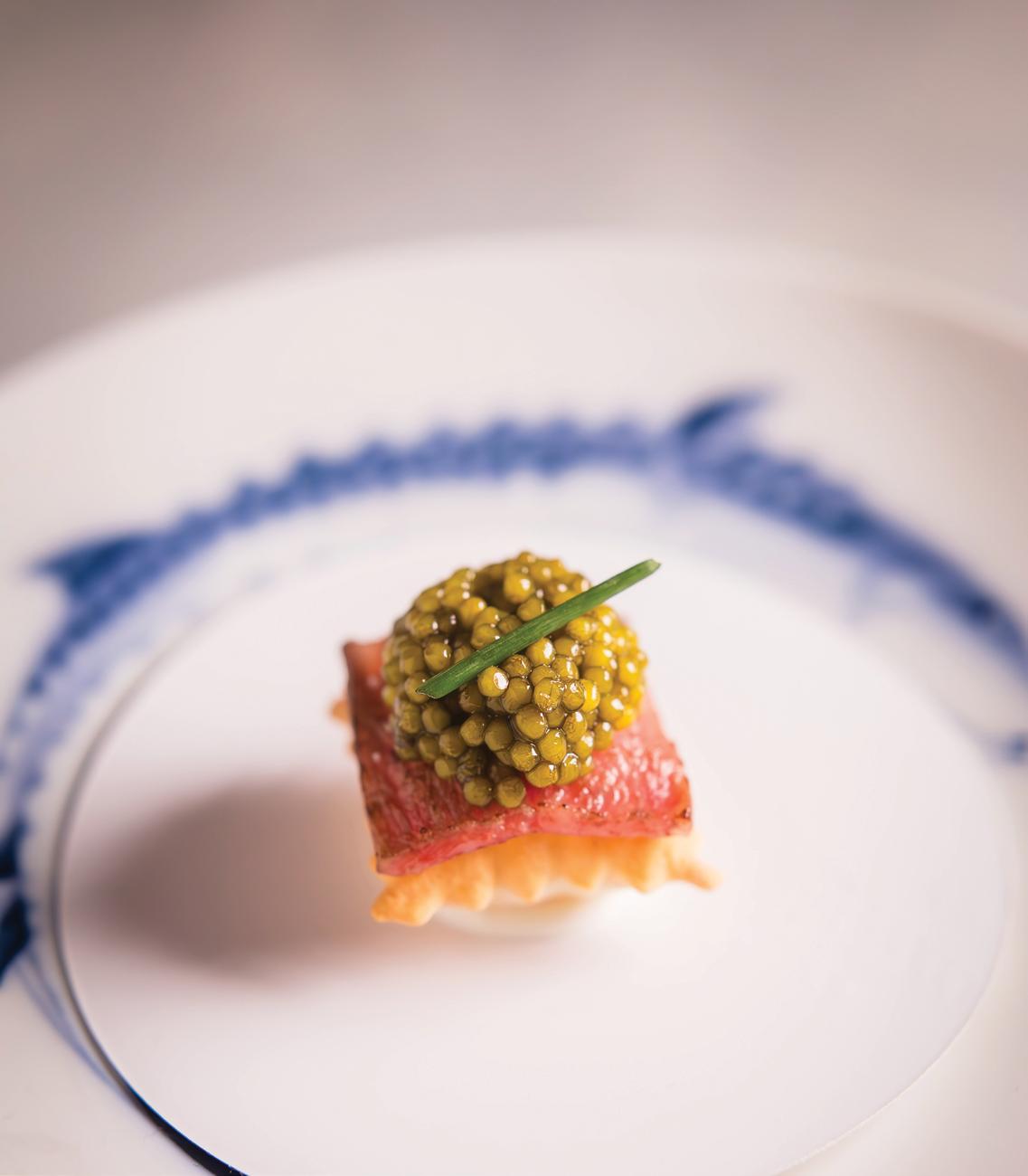 the 10-Day Dry-Aged Shima Aji, a tantalizing combination of citrus-tamarind agua chile intricately sliced and presented as a delicate rose evoking the tastebuds with a delicate balance of freshness and acidity. The wagyu on oyster crackers filled with crème fraiche and topped with a pinch of Golden Ostera Caviar is a decadent indulgence, showcasing the unparalleled quality of the chef’s sourcing. For dessert, the Cinnamon Buñuelos with caramelized milk chocolate crémeux, banana, and horchata offer a sumptuous finale to an extraordinary meal.
