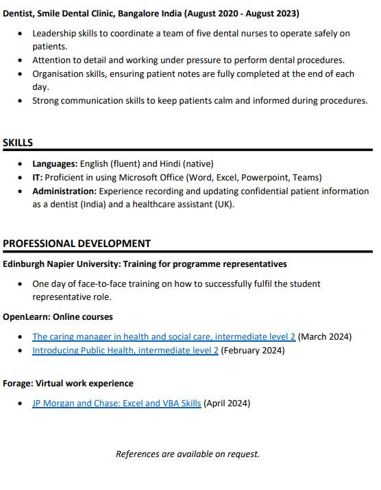 Since September 2023, I have been the Social Media Coordinator for Edinburgh Napier University’s Marketing Society. I have successfully managed the society’s social media accounts, increasing follower engagement by 25% over the past year. This position has enhanced my skills in content creation, audience engagement and social media analytics. I enjoy meeting new people and have developed excellent customer service and communication skills from working as a cashier at Tesco. Balancing study, work and my role as Social Media Coordinator requires good organisation skills and working under pressure, something I could bring to this role.