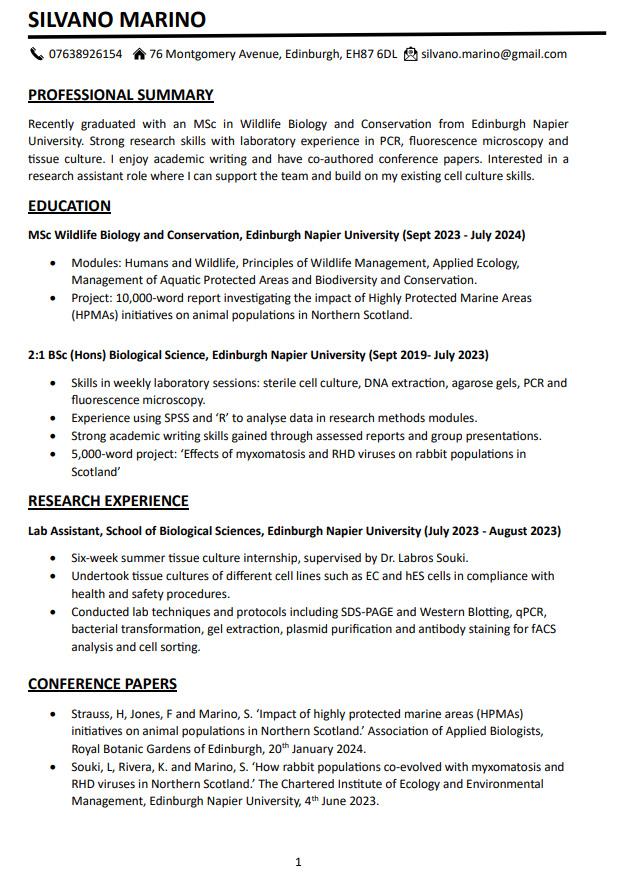 MSc Environmental Sustainability student. Data analysis skills in using SPSS and Graphpad from research modules. Excellent communication and teamwork skills from working as a restaurant supervisor for two years. Organisation and time management skills, having balanced part-time work and full-time study for five years. Interested in a Research Assistant role as the next step into ecology and conservation, with aspirations to complete a PhD.