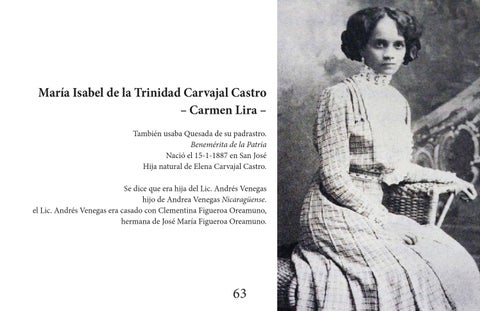 María Isabel de la Trinidad Carvajal Castro – Carmen Lira – También usaba Quesada de su padrastro. Benemérita de la Patria Nació el 15-1-1887 en San José Hija natural de Elena Carvajal Castro. Se dice que era hija del Lic. Andrés Venegas hijo de Andrea Venegas Nicaragüense. el Lic. Andrés Venegas era casado con Clementina Figueroa Oreamuno, hermana de José María Figueroa Oreamuno.