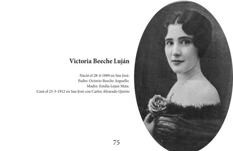 Victoria Beeche Luján Nació el 28-4-1889 en San José. Padre: Octavio Beeche Arguello. Madre: Emilia Lujan Mata. Casó el 23-3-1912 en San José con Carlos Alvarado Quirós