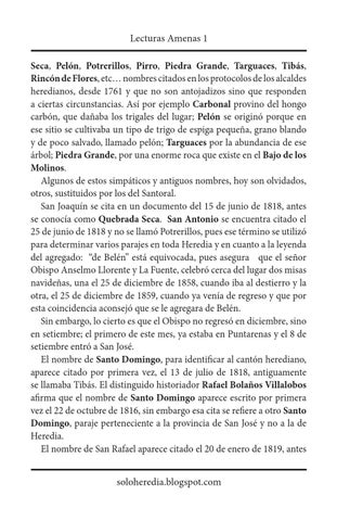 Lecturas Amenas 1 Seca, Pelón, Potrerillos, Pirro, Piedra Grande, Targuaces, Tibás, Rincón de Flores, etc… nombres citados en los protocolos de los alcaldes heredianos, desde 1761 y que no son antojadizos sino que responden a ciertas circunstancias. Así por ejemplo Carbonal provino del hongo carbón, que dañaba los trigales del lugar; Pelón se originó porque en ese sitio se cultivaba un tipo de trigo de espiga pequeña, grano blando y de poco salvado, llamado pelón; Targuaces por la abundancia de ese árbol; Piedra Grande, por una enorme roca que existe en el Bajo de los Molinos. Algunos de estos simpáticos y antiguos nombres, hoy son olvidados, otros, sustituidos por los del Santoral. San Joaquín se cita en un documento del 15 de junio de 1818, antes se conocía como Quebrada Seca. San Antonio se encuentra citado el 25 de junio de 1818 y no se llamó Potrerillos, pues ese término se utilizó para determinar varios parajes en toda Heredia y en cuanto a la leyenda del agregado: “de Belén” está equivocada, pues asegura que el señor Obispo Anselmo Llorente y La Fuente, celebró cerca del lugar dos misas navideñas, una el 25 de diciembre de 1858, cuando iba al destierro y la otra, el 25 de diciembre de 1859, cuando ya venía de regreso y que por esta coincidencia aconsejó que se le agregara de Belén. Sin embargo, lo cierto es que el Obispo no regresó en diciembre, sino en setiembre; el primero de este mes, ya estaba en Puntarenas y el 8 de setiembre entró a San José. El nombre de Santo Domingo, para identificar al cantón herediano, aparece citado por primera vez, el 13 de julio de 1818, antiguamente se llamaba Tibás. El distinguido historiador Rafael Bolaños Villalobos afirma que el nombre de Santo Domingo aparece escrito por primera vez el 22 de octubre de 1816, sin embargo esa cita se refiere a otro Santo Domingo, paraje perteneciente a la provincia de San José y no a la de Heredia. El nombre de San Rafael aparece citado el 20 de enero de 1819, antes soloheredia.blogspot.com