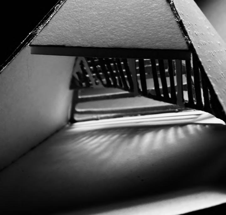 Throughout architecture light plays a vital role as well as shadows. To do this we chose 3 images and recreated them to understand how light works in different habitats. The studio was tasked with creating a light vessel to study the qualities that light is capable of creating. The vessel created was focused on the study of the light quality it created rather than the shadows produced. My design began as a triangular prism with both ends removed. One of the ends had slits that intercepted each other in varying angles. The model also included a colored wall to create a glowing quality once the light shined through the slits.