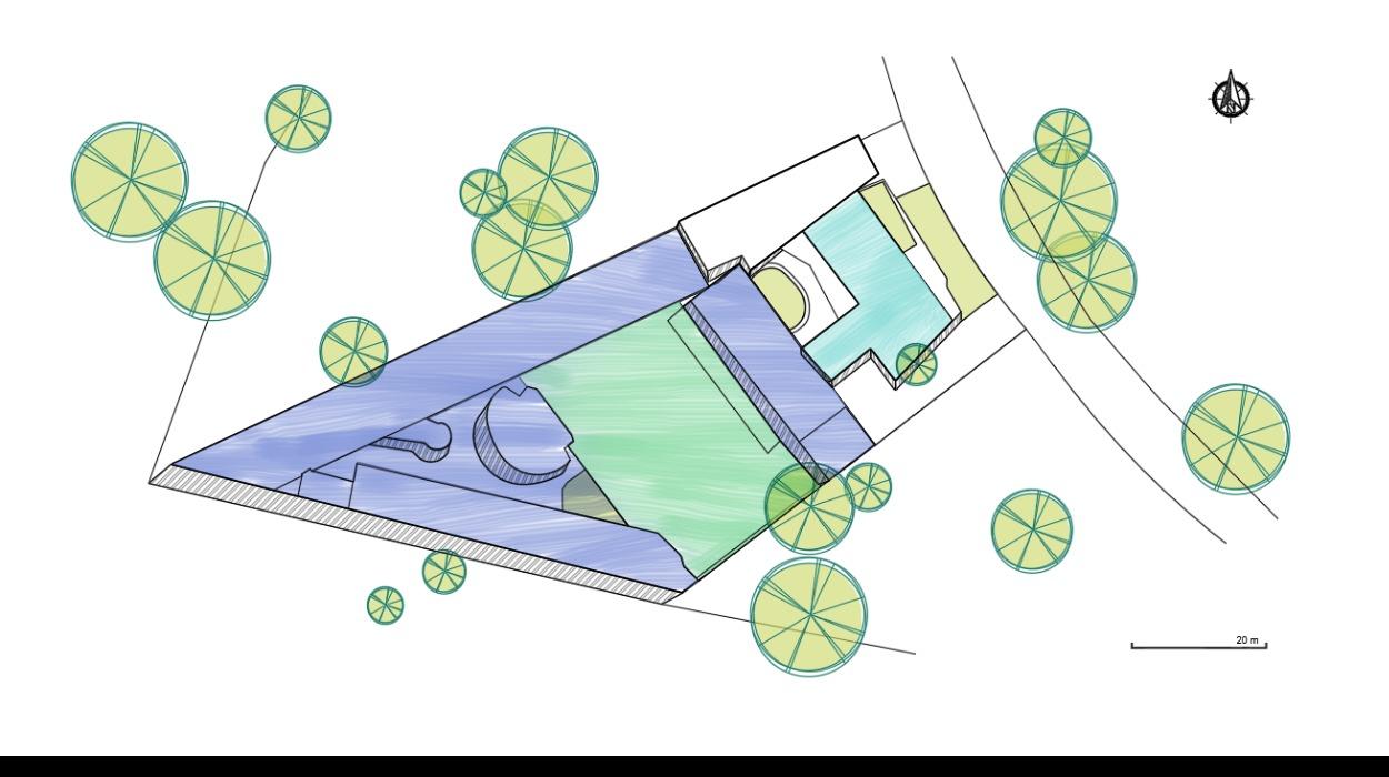 El segundo volumen, como sector privado para trabajo o conferencias, es un polígono irregular. Conserva los colores sobrios, con balcones de corrido con barandas de metal al igual que su circulación vertical. El segundo nivel simula una planta libre con las ventanas longitudinales hacia otro jardín interior.