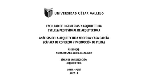 FACULTAD DE INGENIERIAS Y ARQUITECTURA ESCUELA PROFESIONAL DE ARQUITECTURA ANÁLISIS DE LA ARQUITECTURA MODERNA: CASA GARCÍA (CÁMARA DE COMERCIO Y PRODUCCIÓN DE PIURA) ASESOR(A): MOROCHO GAGO, LAURA ALEXANDRA LÍNEA DE INVESTIGACIÓN: ARQUITECTURA PIURA - PERÚ 2022 - I