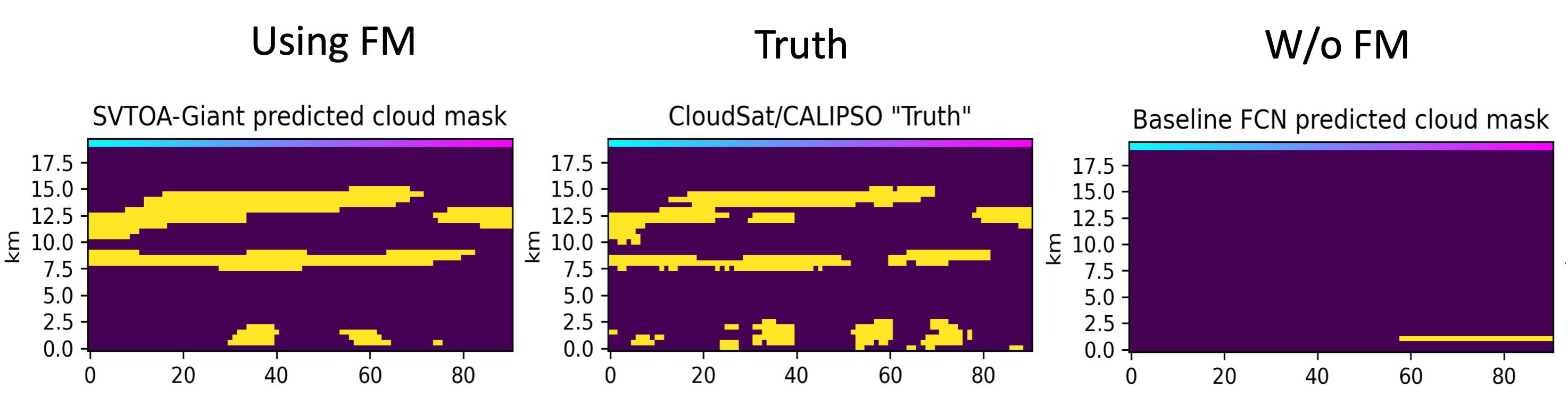 random images taken over a 10-year period, representing different seasons, surface situations and inter-annual variabilities. The team built two MODIS allsky-radiance-based foundation models (MODIS-Top-of-Atmosphere [TOA]-Huge and MODIS-TOA-Giant). The models adopted the Mask-Image-Modeling (MIM) framework to train and learn detailed contextual representation of all-sky images (i.e., including clouds and other atmospheric phenomena) through self-supervised learning without any labels. These conditions make the models suitable for a variety of downstream tasks, including those related to the atmosphere. The two models where trained based on 200 million all-sky MODIS images with 658 million (MODIS-TOA-Huge) and three billion (MODIS-TOA-Giant) parameters; the latter, later re-named “SatVision-TOA”, is the largest foundation model trained solely on satellite images (to the team’s best knowledge).