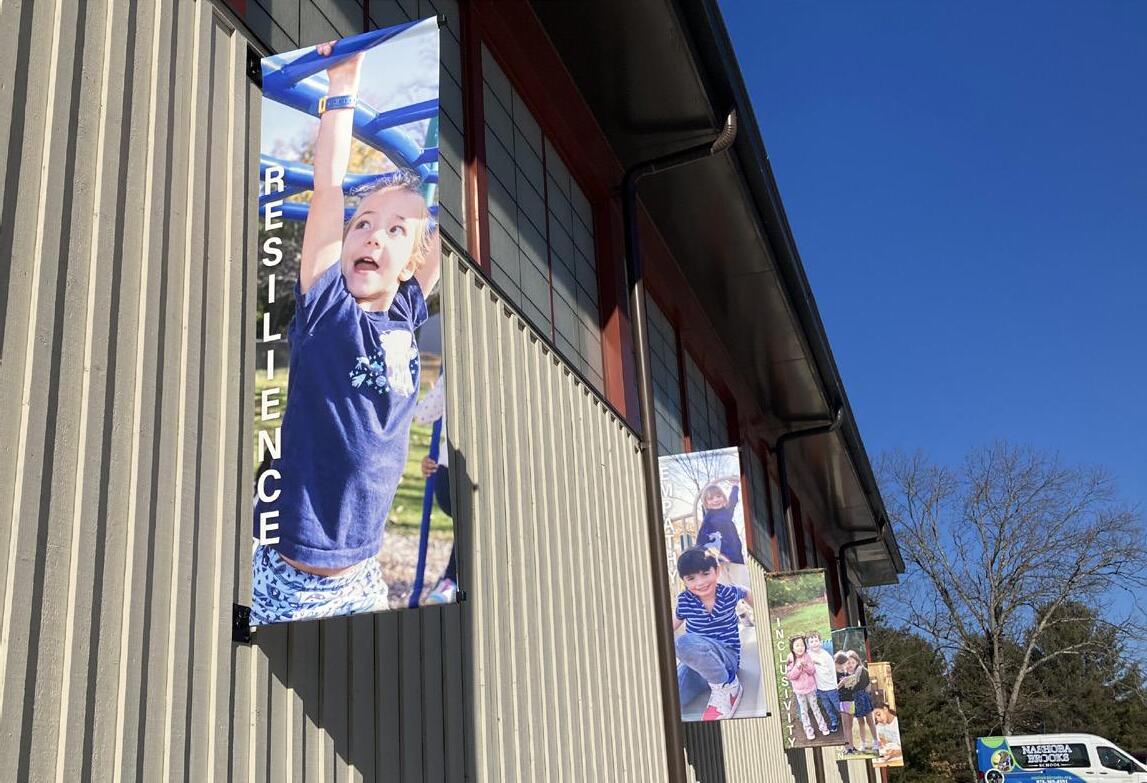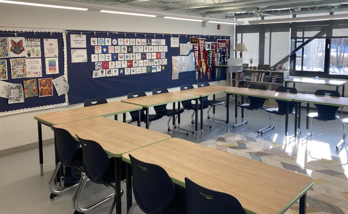 1. The new fitness room for Middle School students and employees 2. The Pond Shed was renovated this fall, now serving as a launching point for outdoor adventures 3. The main reception was brightened up this summer with a mural of Middle School students 4. Core Values flags now hang on the exterior of Moriarty Gymnasium 5. Initiatives