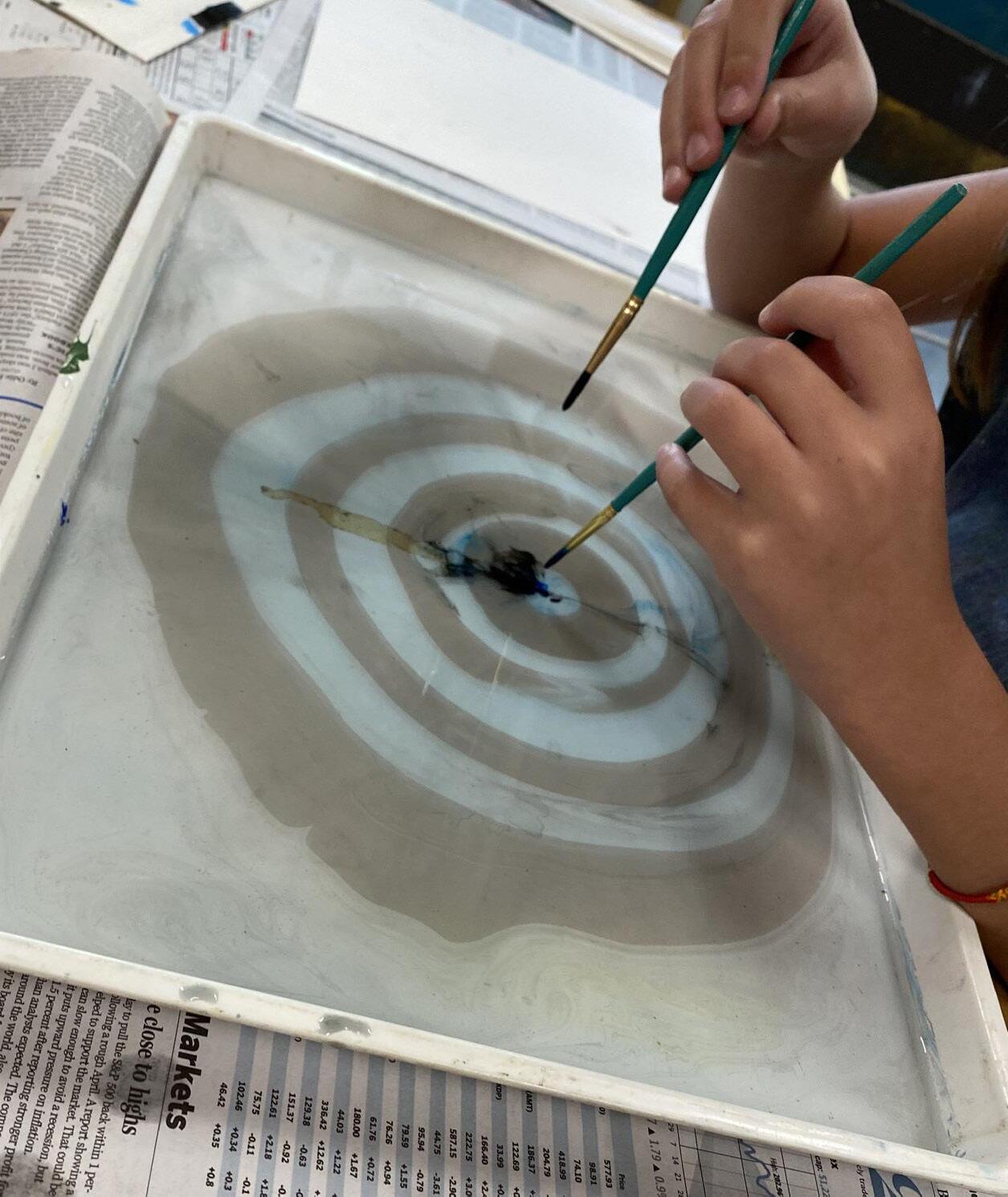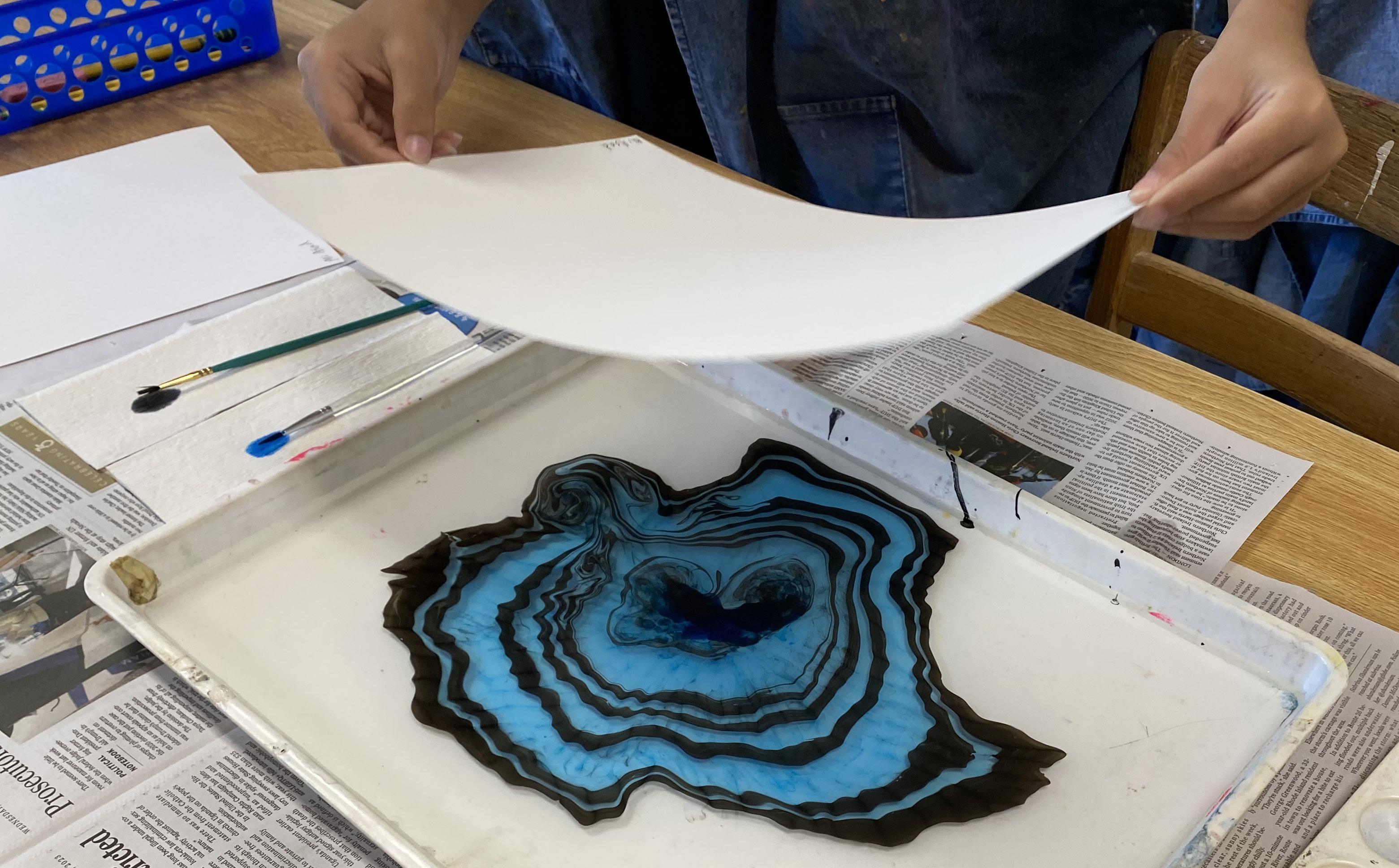 Grade 3 students learned about the Japanese art of suminagashi or “floating ink” and worked to create unique designs with ink and water. These beautiful papers then became the front and back covers of their sketchbooks for the year.