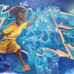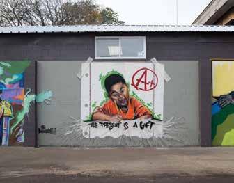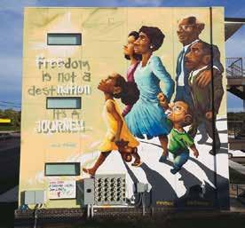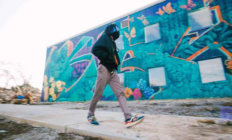 “I want to invite the community to be a part of this mural we’re creating. I want it to reflect the community and its legacy,” Jenkins says. “We want to acknowledge our history, our ancestors and what they left behind. You also want to pass the baton. I want to make sure I’m providing opportunities and speaking messages onto the wall. We want this to be something that will represent the community and for it to be something the community will be proud of seeing. It’s like a gift. I’m from here, and I want to leave something here that’s going to be up for years.” NI