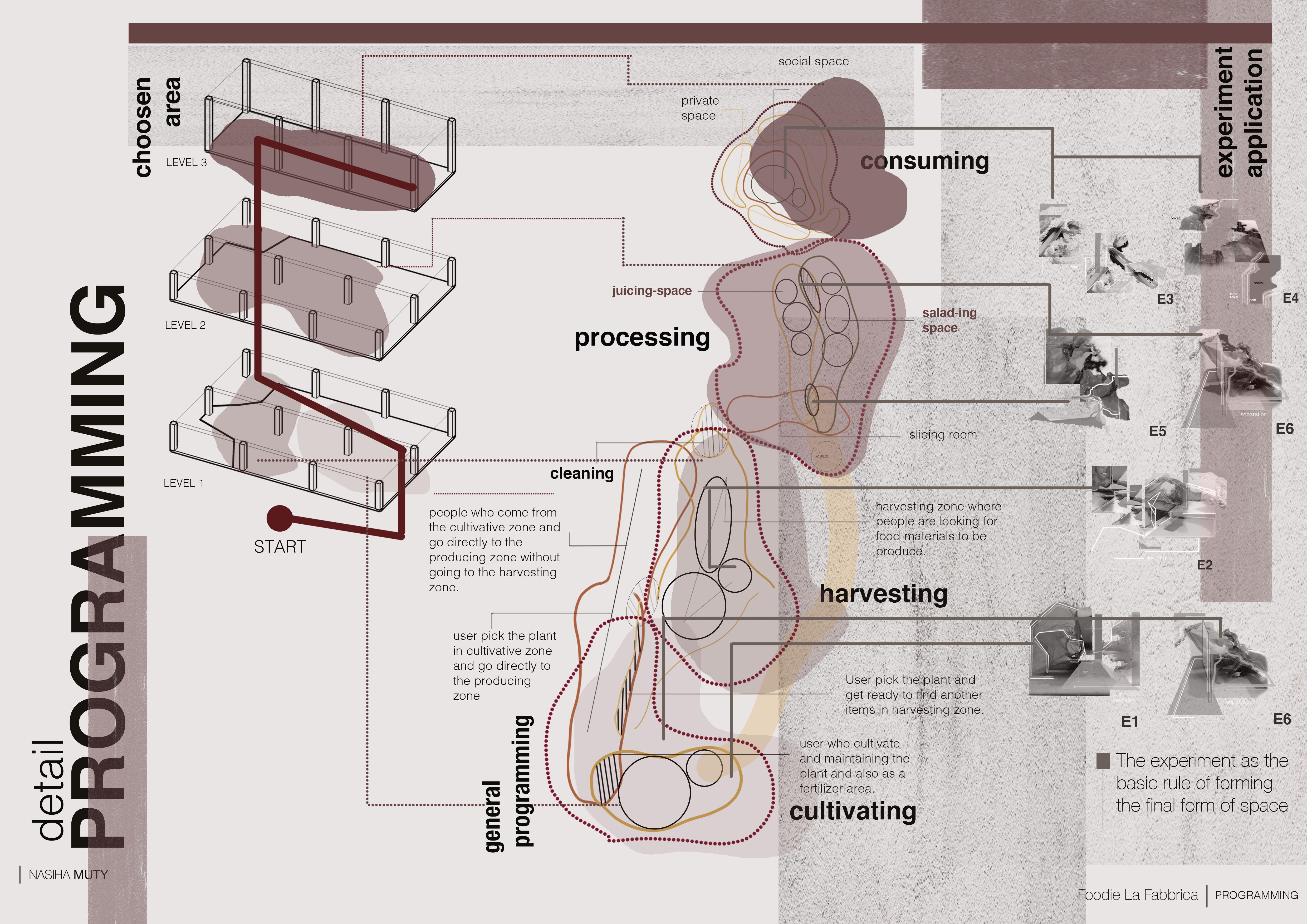 Foodie La Fabbrica is a spatial concept of how the interior, as the first and the most intimate environment of our bodies could encounter, exists to enhance the user’s wellbeing as a design purpose. This public interior intervention is located in the South Quarter Building, which is highly close to the abundance of sedentary behavior due to the office working activities. That condition may constantly be a risk to human bodies, both physically and psychologically. Therefore, wellness is emphasized to stimulate a healthier lifestyle for the inhabitants. In the end, users are expected to adopt these practices into their new daily routine program.