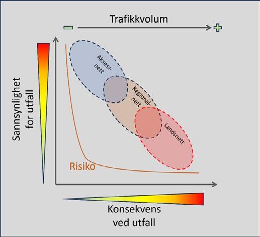 Illustrasjonen i figur 4 gir ei forenkla, visuell framstilling av risikoen for utfall i ulike delar av ekomnettet, uttrykt som sannsyn for og konsekvens av ulike uønska hendingar. Figuren viser òg korleis trafikkvolumet aukar frå aksessnett til transportnett. I tråd med dette har utfall i regional- og landsnett (transportnett) større konsekvensar enn utfall i aksessnett, men sannsynet for slike hendingar er lågare grunna høgare robustheit. Dette kjem mellom anna av ein annan nettverkstopologi og fleire risikoreduserande tiltak.