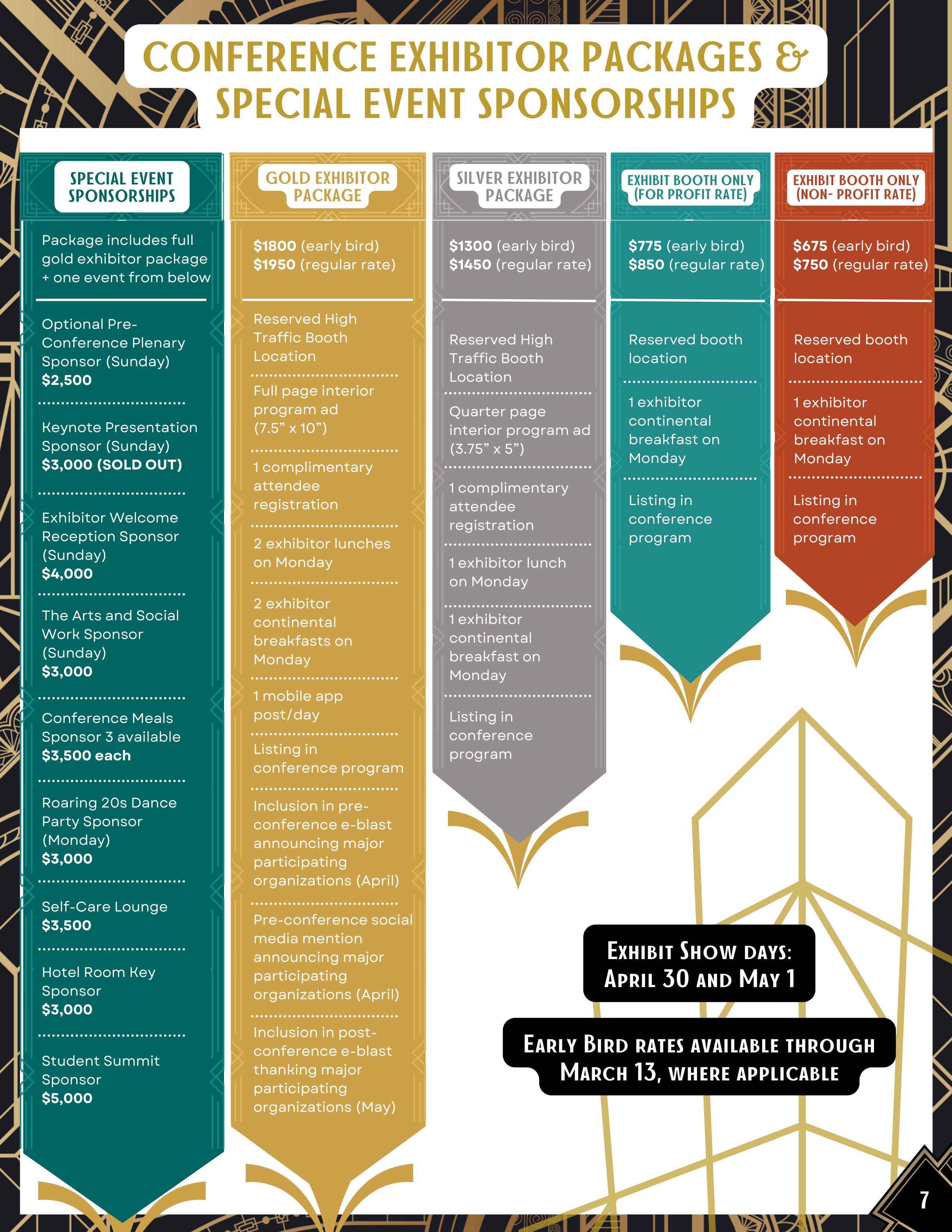 D Sponsored Post - $150 w/ exhibitD Exhibit Booth Only - For Profit $775 $850 -D Exhibit Booth Only - Non-Profit $675 $750 D Sponsored Post - $200 w/o exhibit BAG STUFFERS □ Career Center $100 Listing w/exhibit D BagStufferw/boothpurchase t $100 D BagStufferonly $150 □ Career Center $150 Listing w/o exhibit SUBTOTALA:$ SUBTOTAL B:$ SPECIAL EVENT SPONSORSHIPS D Keynote Presentation Sponsor (Sunday) - $3,000 (SOLD OUT) □ Exhibitor Welcome Reception Sponsor (Sunday) - $4,000 D Optional Pre-Conference Plenary Sponsor (Sunday)$2,500 □ The Arts and Social Work Sponsor (Sunday) - $3,000 □ Conference Meal Sponsors (3 Available) - $3,500 each □ Roaring 20s Dance Party Sponsor (Monday) - $3,000 -D Hotel Room Key Sponsor$3,000 D Conference App Sponsor$2,500 I I D Self-Care Lounge SponsorSUBTOTALC:$