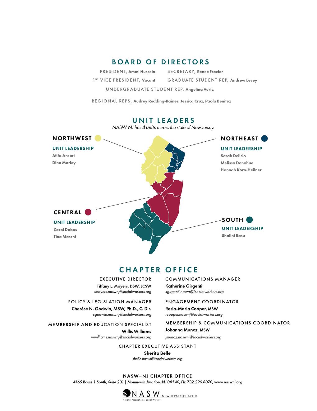 The NASW-NJ Chapter volunteer leadership is composed of social workers just like yourself, who are passionate about our field, our collective purpose, and have a desire to contribute to the dialogue and lend their talents and voices to the betterment of our Chapter.