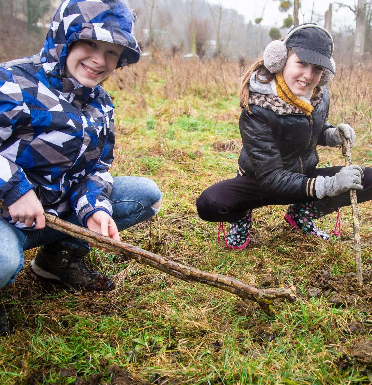 de kaka van de paarden en runderen en trekken die kak mee de grond in. Daar ontstaan piepkleine gangetjes.” “Ah, zo kan het water dus beter wegstromen!” zegt Pieke. “Juist, dat is natuurlijk veel beter dan een gebied met beton of tegels”, zegt Josien. Dan geeft ze de Rangers een opdracht: “Kunnen jullie paardenkak vinden?” Pieke en Fleur hebben al snel een grote hoop gevonden. Even wroeten met een tak… en kijk: “Een heleboel wormen”, merkt Fleur op. “Die zijn dus belangrijker dan ik had gedacht.”