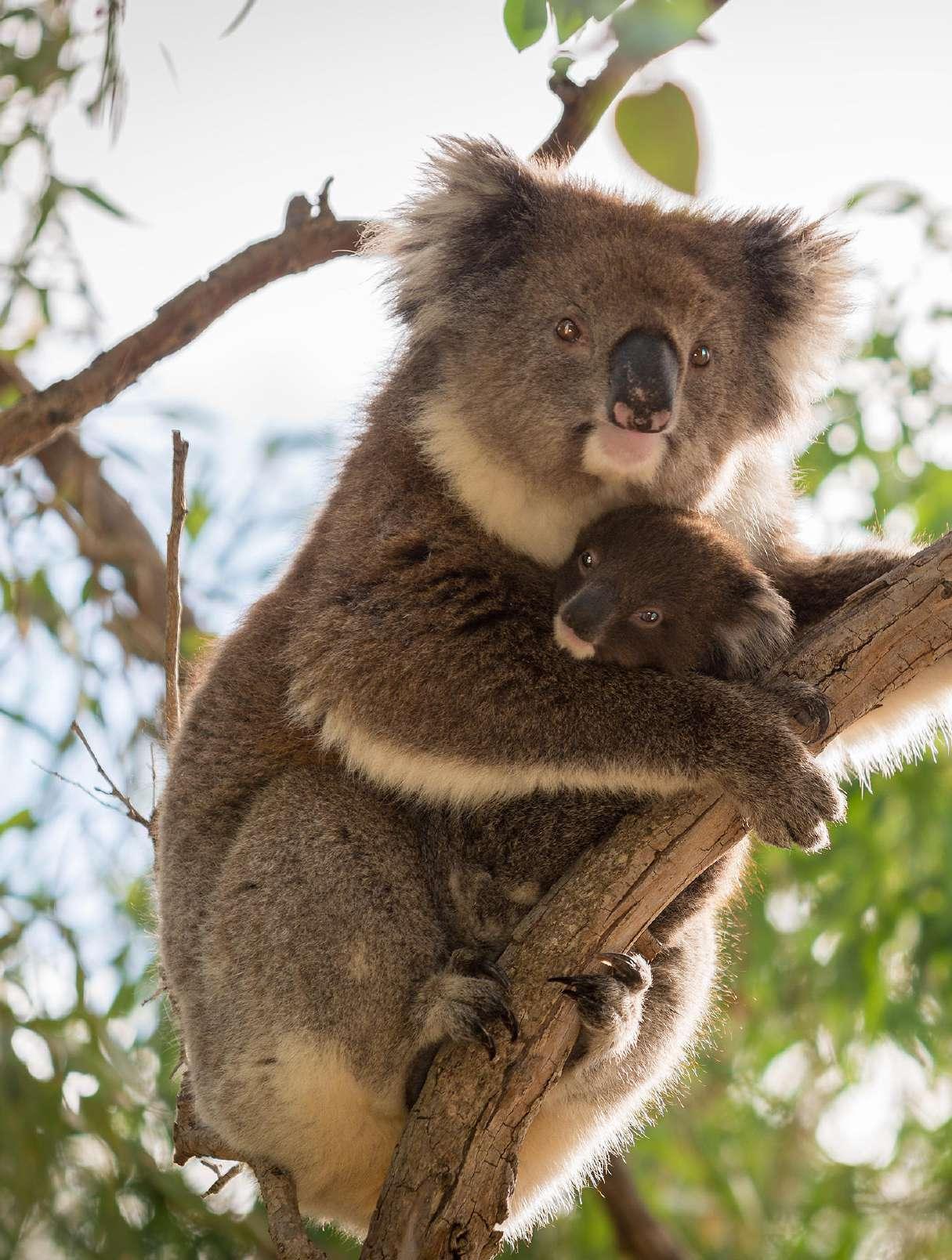 In Australië groeien veel eucalyptus-bomen. De bladeren ruiken naar hoestsnoepjes en smaken scherp. Geen dier dat daar tegen kan. Behalve de KOALA, die lust niks anders. In zijn darm zitten bacteriën die helpen de bladeren te verteren. Een baby-koala heeft die nog niet, maar daar is wat aan te doen. Na drie maanden melk drinken steekt hij zijn kopje uit de buidel. De opening daarvan zit bij koala’s aan de onderkant. Dat komt goed uit, want zo kan het kindje makkelijk de speciale kaka oplikken die zijn moeder voor hem maakt. Met die kak-pap krijgt de koalakleuter de goede bacteriën binnen.