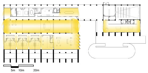 Mesmo que à primeira vista pareça uma definição contraditória quando se trata de residências unifamiliares, os diferentes níveis de “privacidade” demarcados por gradações cromáticas permitem compreender as relações dos espaços de uma casa entre si e entre eles e o ambiente externo. Na sequência, as análises prosseguem para identificar o tempo de permanência nos ambientes, classificando-os como de uso prolongado, moderado e de passagem.