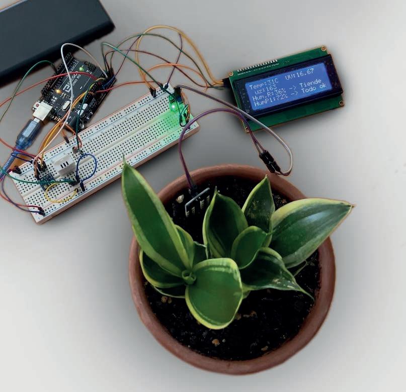 Además de las redes de conexión interespecie ya existentes en el municipio, al proyecto del sistema de filtración de aguas, se le suma un indicador que nos permite conocer las necesidades de la planta en cada momento y mejorar la comunicación de las especies vegetales con el humano a través de datos dados por detectores de humedad en el sustrato y en el ambiente, de cantidad de luz y rayos UV. Este indicador se ha modelado en la realidad para corroborar que los parámetros estudiados se miden y son leídos de forma accesible para la población. Para ello se ha utilizado una placa de Arduino que sirve como base para la conexión de los diferentes sensores. A ella se le ha sumado una pantalla que permite leer los diferentes datos tomados, los cuales se han filtrado de tal manera que indican la acción necesaria a hacer por el humano: darse una ducha, tender la ropa, etc; en caso de que la planta necesite más humedad ambiental o el sustrato esté por debajo de la humedad idónea.