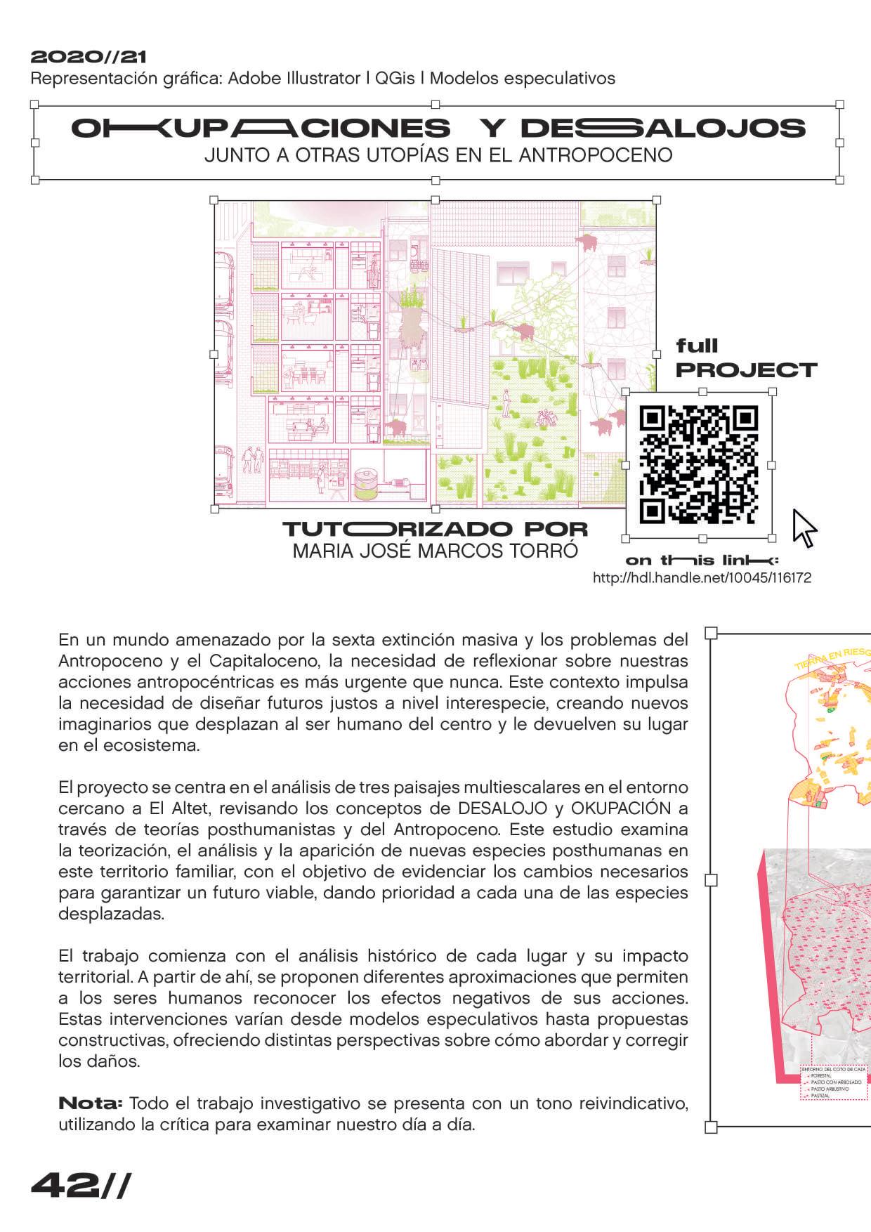 Bajo un interés por desdibujar los límites entre los modos de vida humanos y las especies compañeras, este trabajo usa una pequeña pedanía del campo de Elche - El Altet - como lugar de oportunidad para atajar la ceguera ecosistémica que caracteriza a nuestra generación. Esta población nos sirve de ejemplo para evidenciar el efecto del cambio socioeconómico, consecuente del éxodo rural y el modelo capitalista, en nuestros núcleos urbanos. Ya que a finales de los 60, la principal zona agrícola del área cesa su actividad productiva para albergar el aeropuerto de la ciudad de Alicante. Un hecho que provocó que una población vinculada al campo se acabase convirtiendo en un pequeño barrio de periferia con todo lo que eso conlleva.