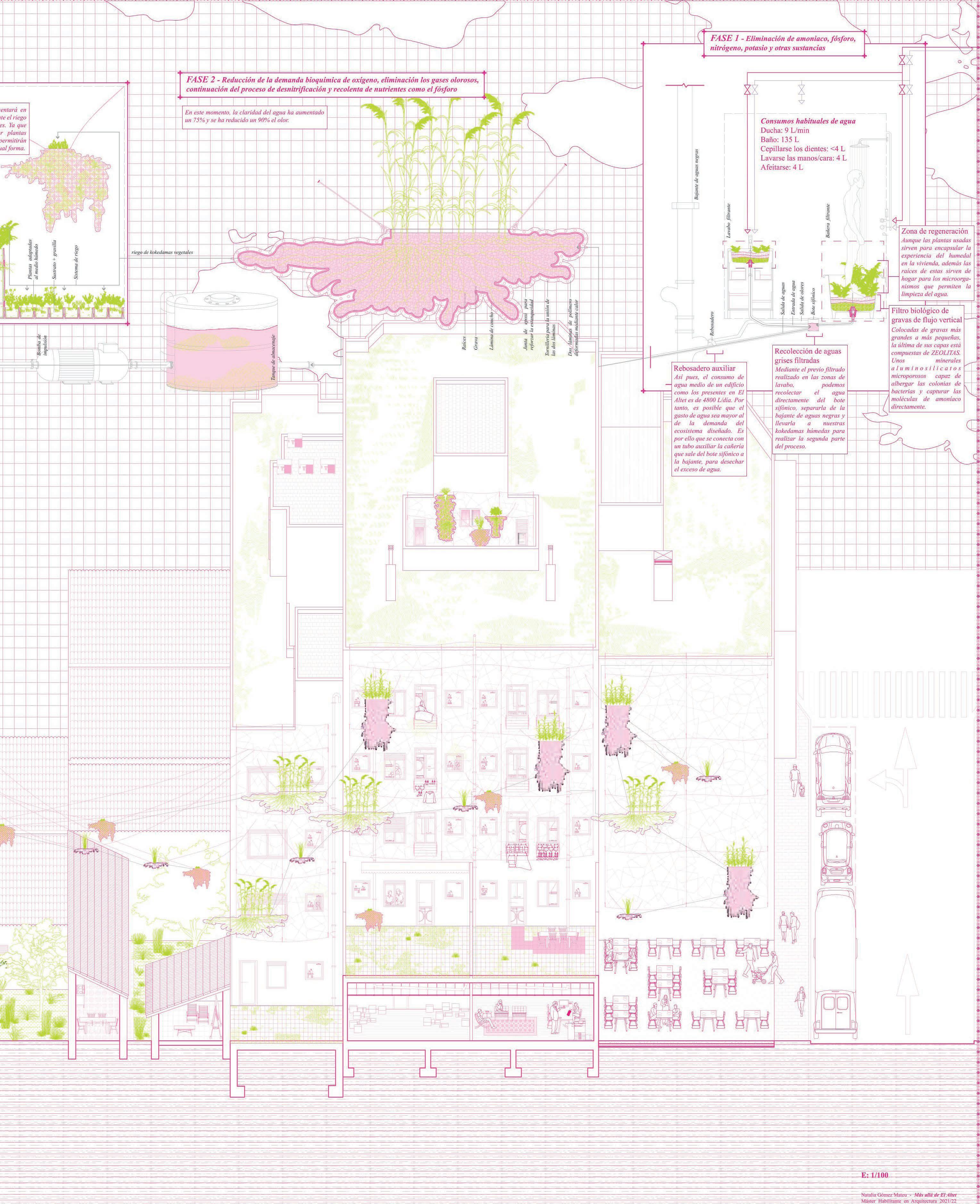 Observando en la imagen de la derecha el producto final del trabajo. El cual tras realizar un registro sobre los diferentes actores presentes en el hábitat y conociendo las relaciones existentes en el ecosistema de El Altet, propone una serie de intervenciones, donde se rediseñan los patios de manzana para poderlos hacer parte del ecosistema que rodea al municipio. Para ello, se incorporan humedales contruidos, elementos vegetales colgantes que repiensan el concepto de “kokedama” vinculandolas a los saberes populares de la zona y que permiten a las plantas crecer como si estuvieran en el medio natural, permitiendo la conexión entre las raíces de los diferentes sujetos vegetales. Todo ello se mantiene gracias a generar una dependencia directa entre el ser humano y el ecosistema mediante la creación de un sistema de tratamiento de aguas basado en las ecomáquinas de John Tood.