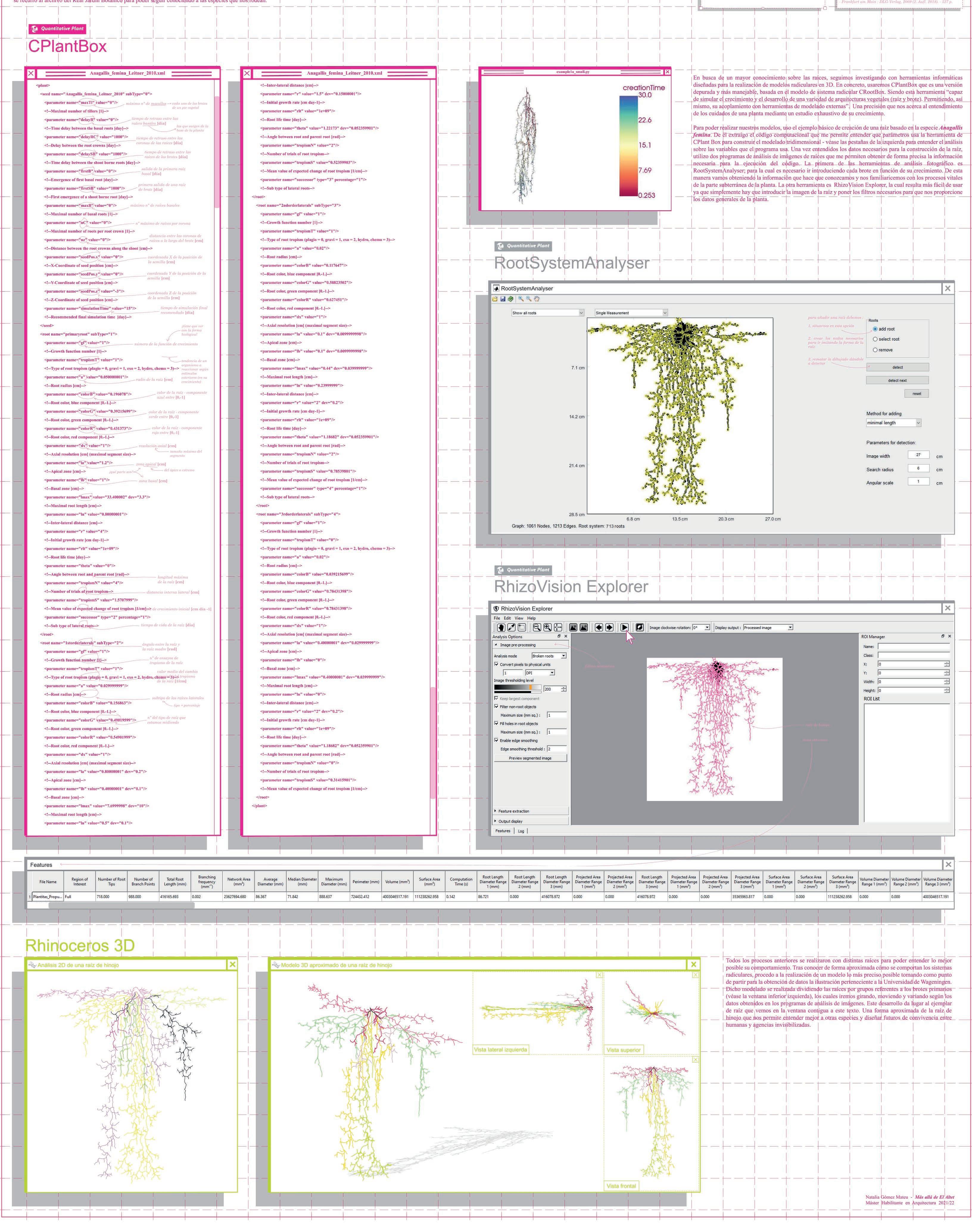 En busca de un mayor conocimiento sobre las raíces, comienzo a investigar herramientas informáticas diseñadas para la realización de modelos radiculares en 3D. En concreto, usaré CPlantBox, una versión depurada y más manejable del modelo CRootBox. Esta herramienta es “capaz de simular el crecimiento y el desarrollo de una variedad de arquitecturas vegetales (raíz y brote). Permitiendo, así mismo, su acoplamiento con herramientas de modelado externas”. Una precisión que nos acerca al entendimiento de los cuidados de una planta mediante un estudio exhaustivo de su crecimiento.