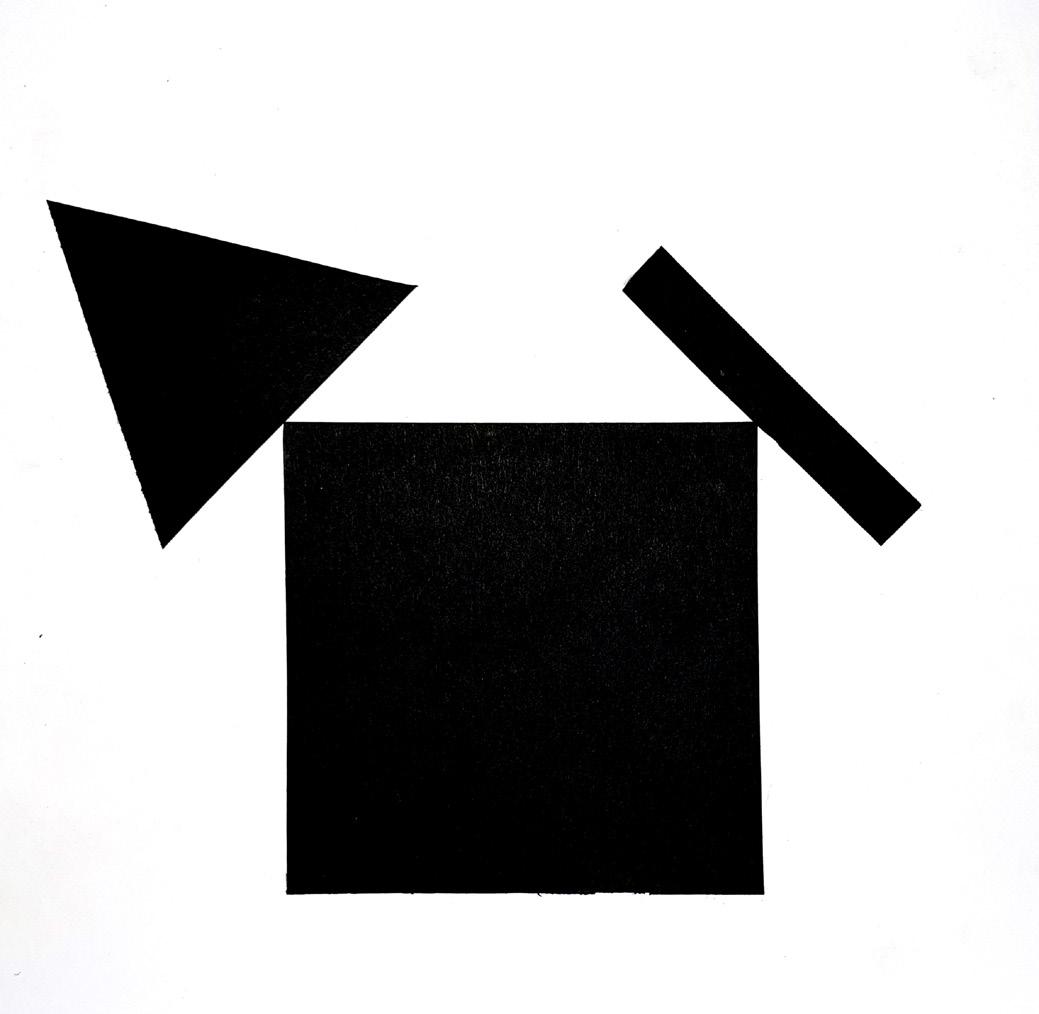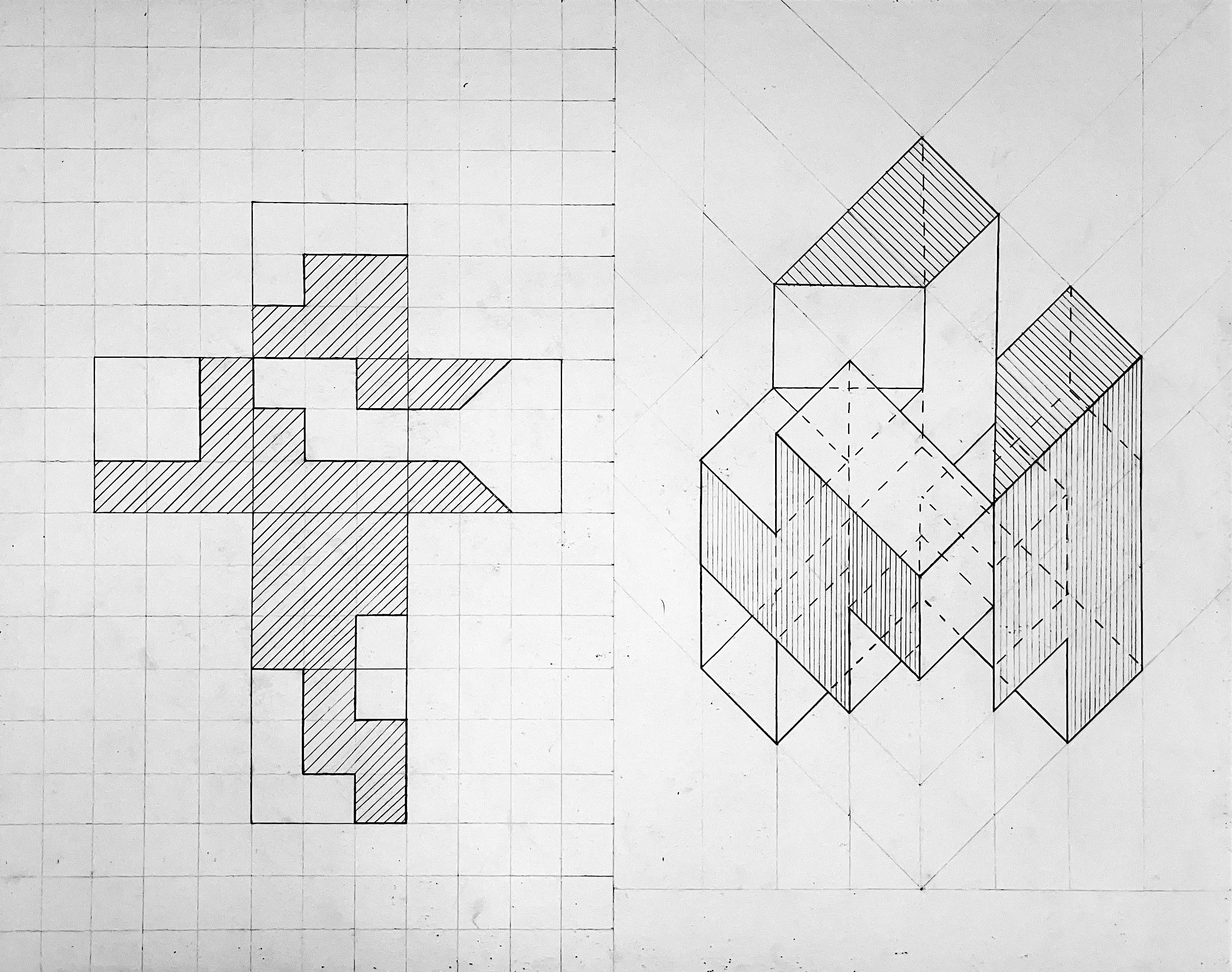 These four connecting tiles aspire to convey a united and cohesive compositon through the flow of black fields, gray figures, and hatches across tiles. The lower left tile later inspired a one-point perspective drawing.