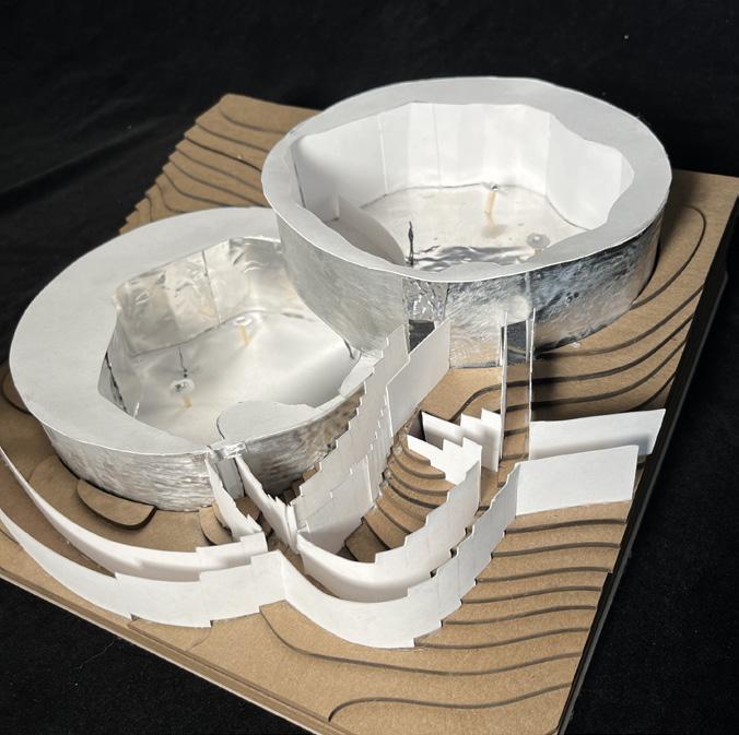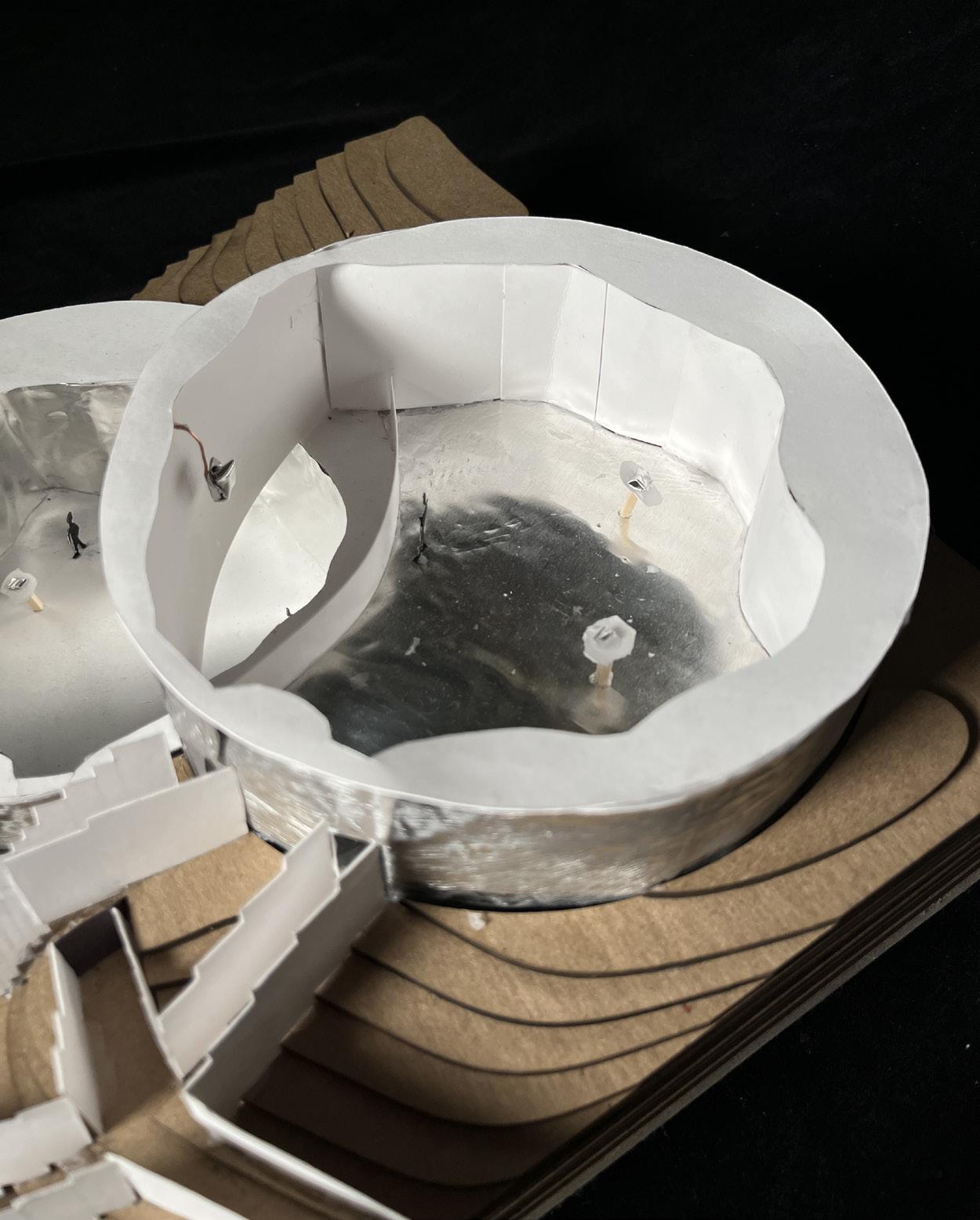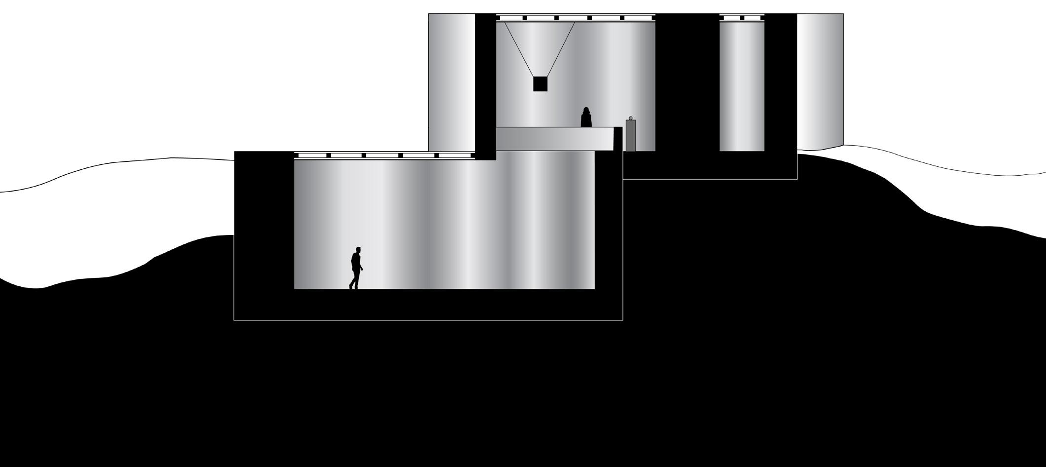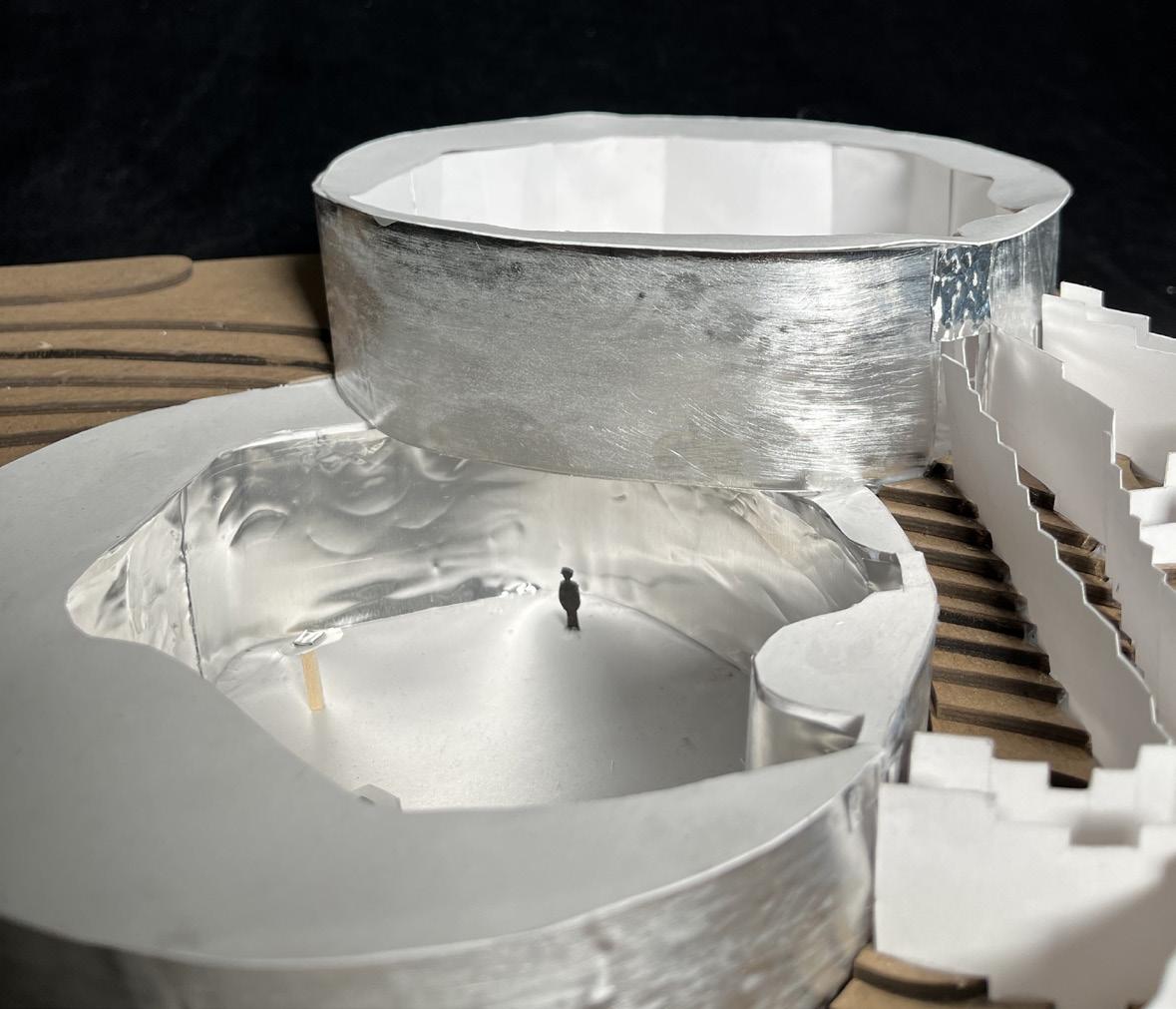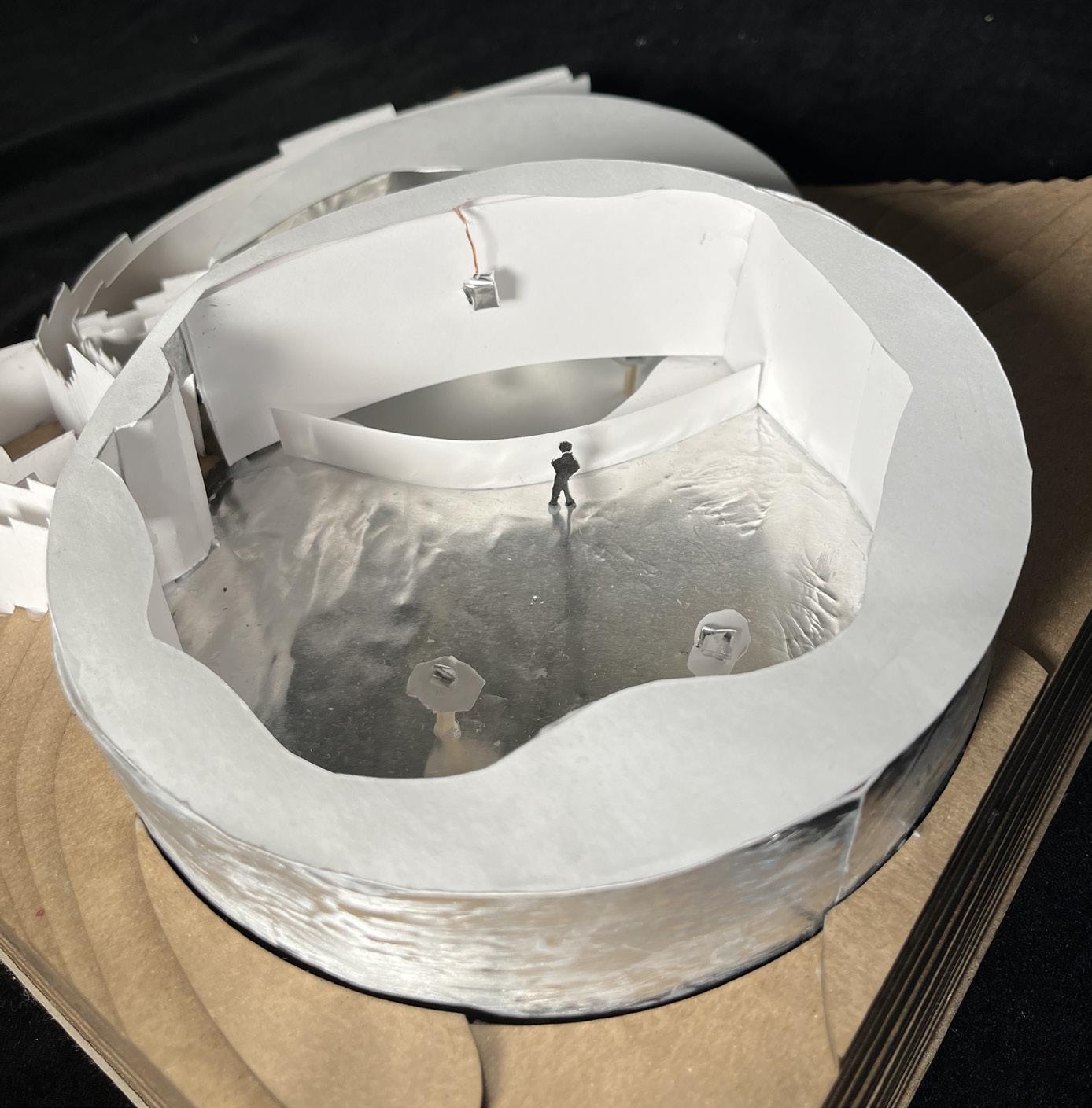 Several field conditions experiments inspired the concept of the pavilion as centered around the overlap between two circular spaces at different elevations. This overlap acts as an area of union between separate spaces and as a focal point that displays an object that is suspended from above and can be viewed from both the upper and lower floors.