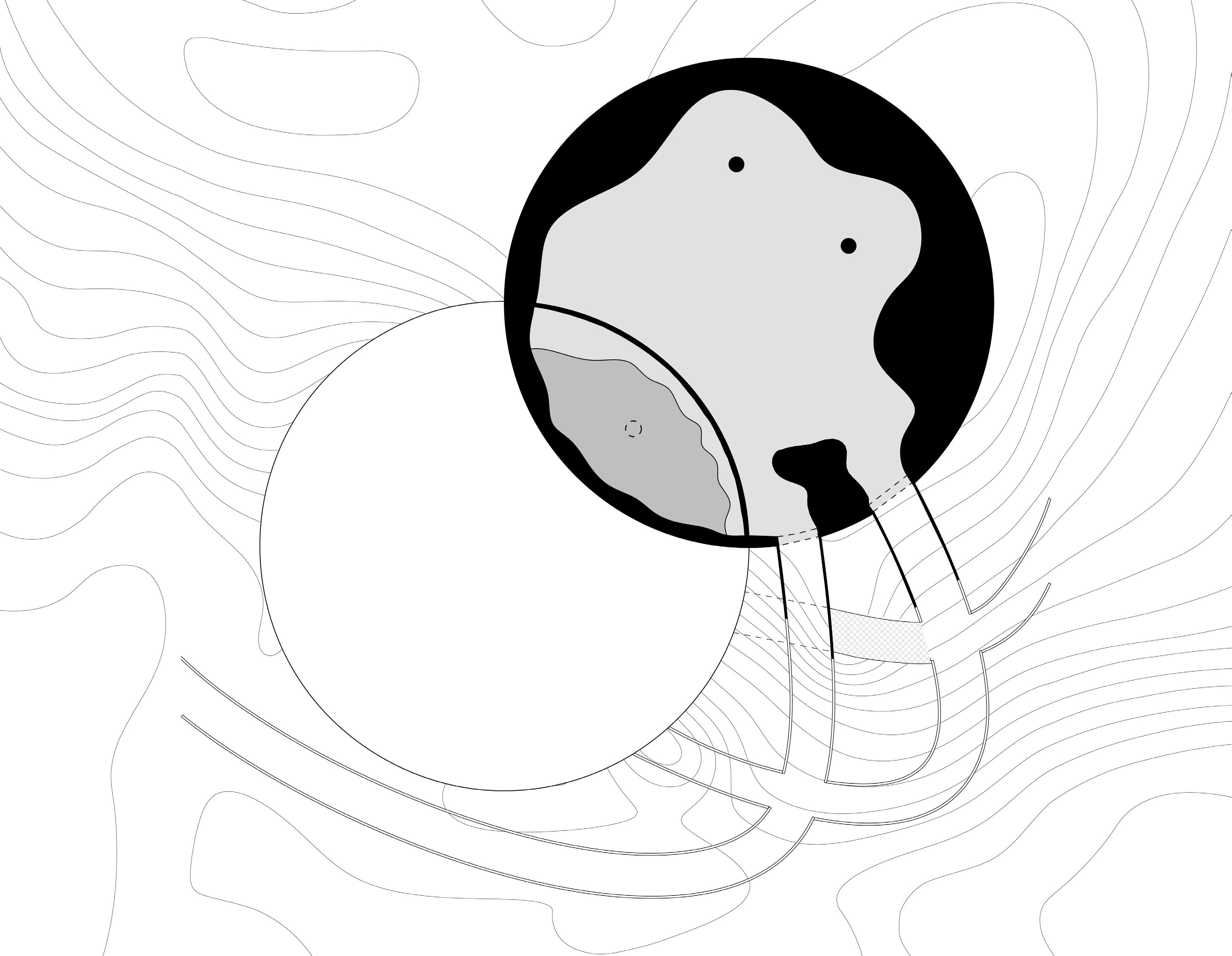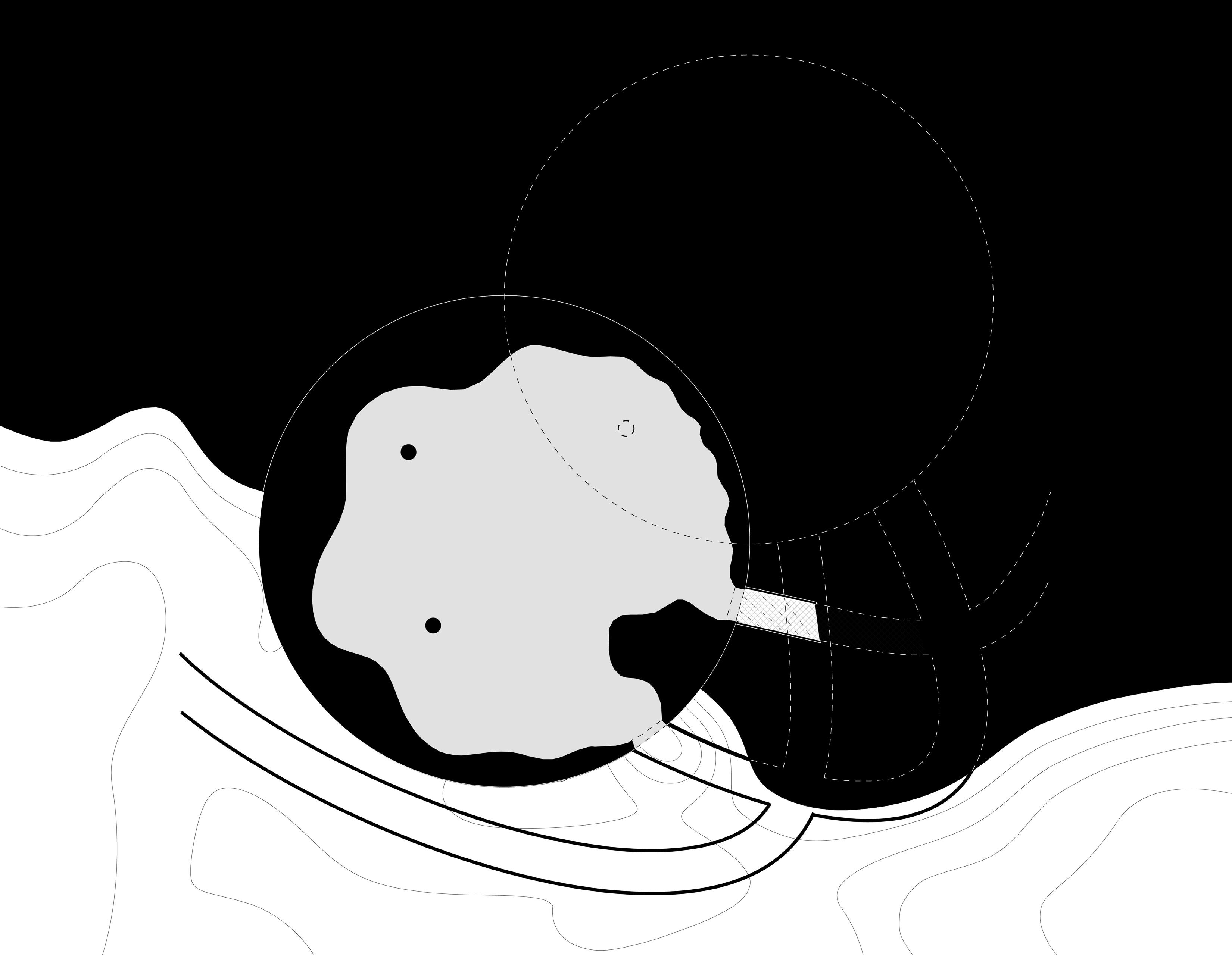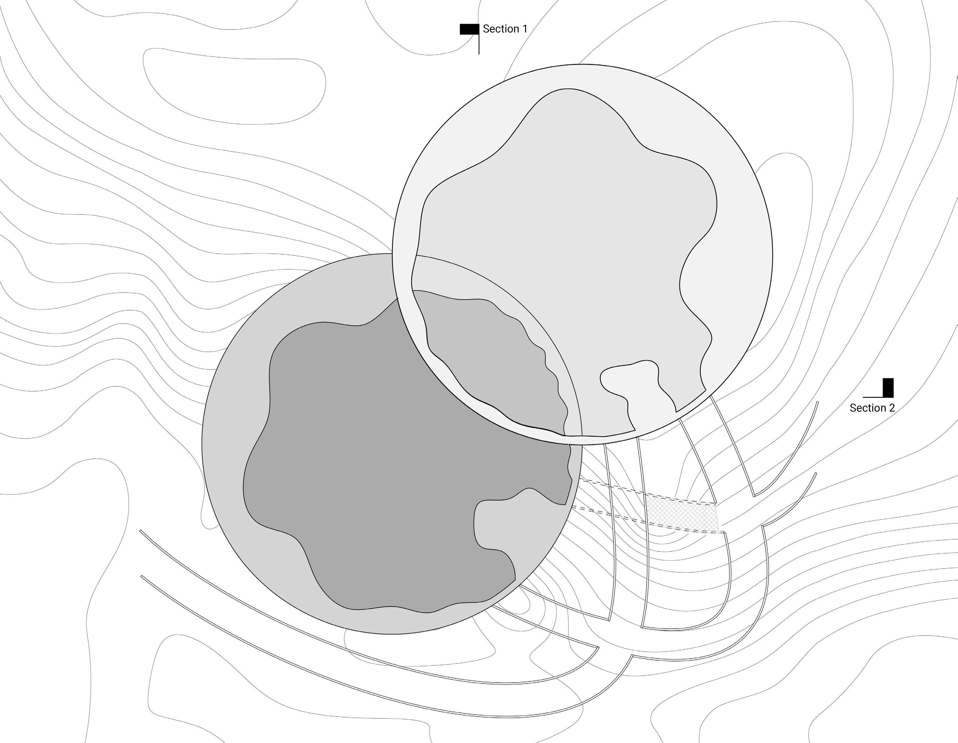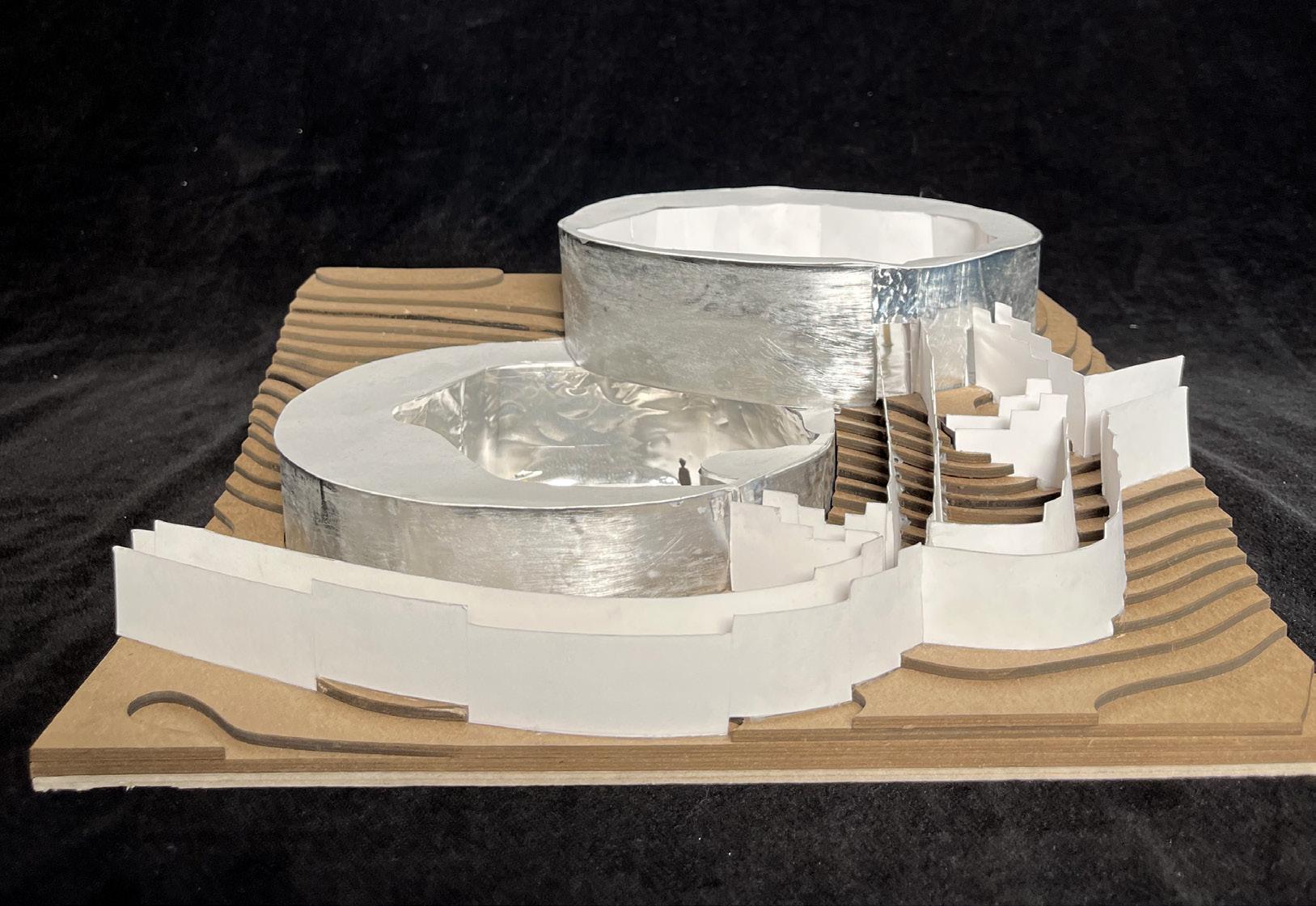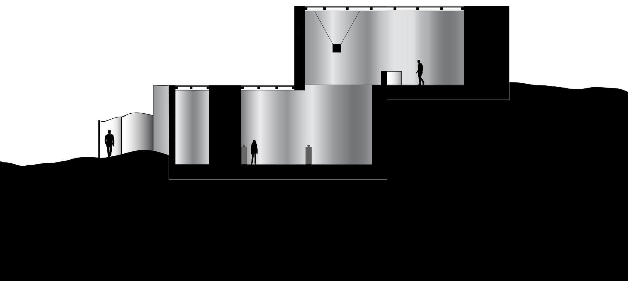 Several field conditions experiments inspired the concept of the pavilion as centered around the overlap between two circular spaces at different elevations. This overlap acts as an area of union between separate spaces and as a focal point that displays an object that is suspended from above and can be viewed from both the upper and lower floors.