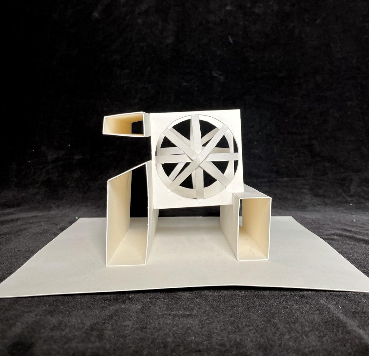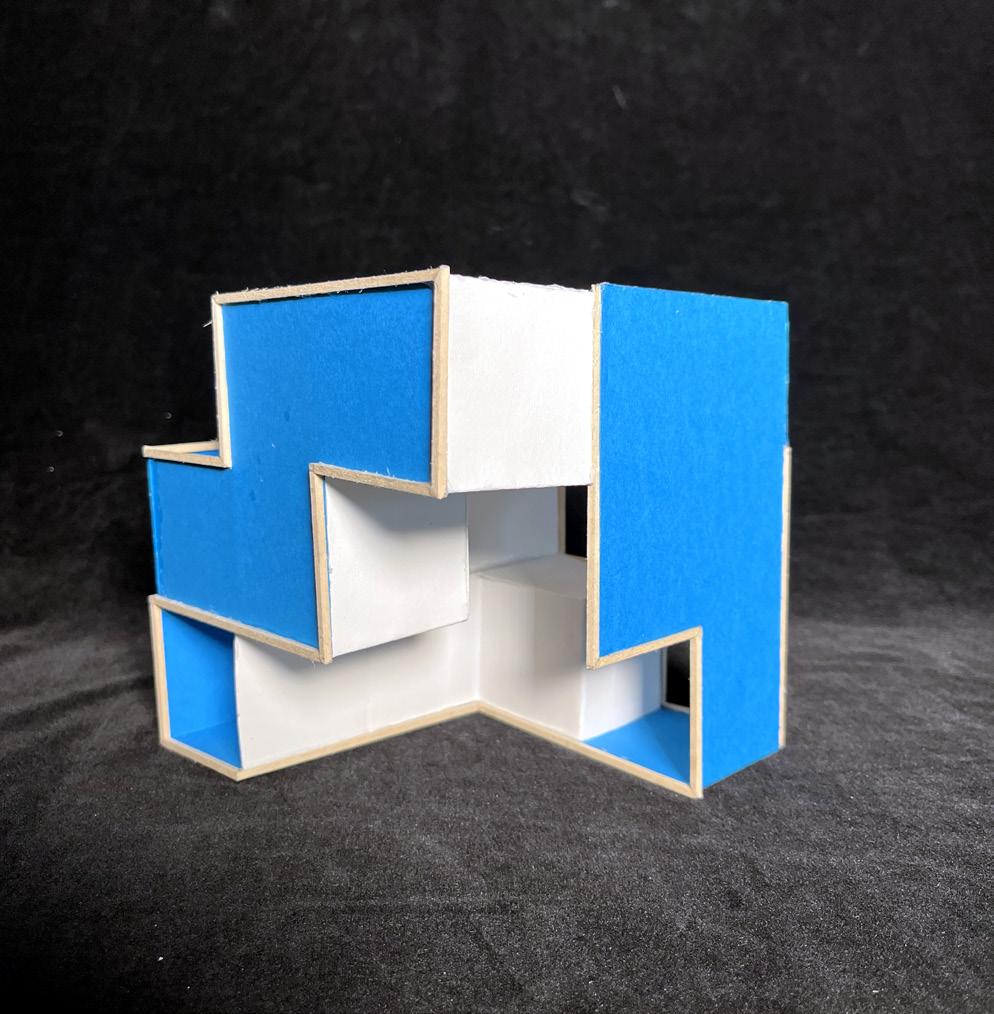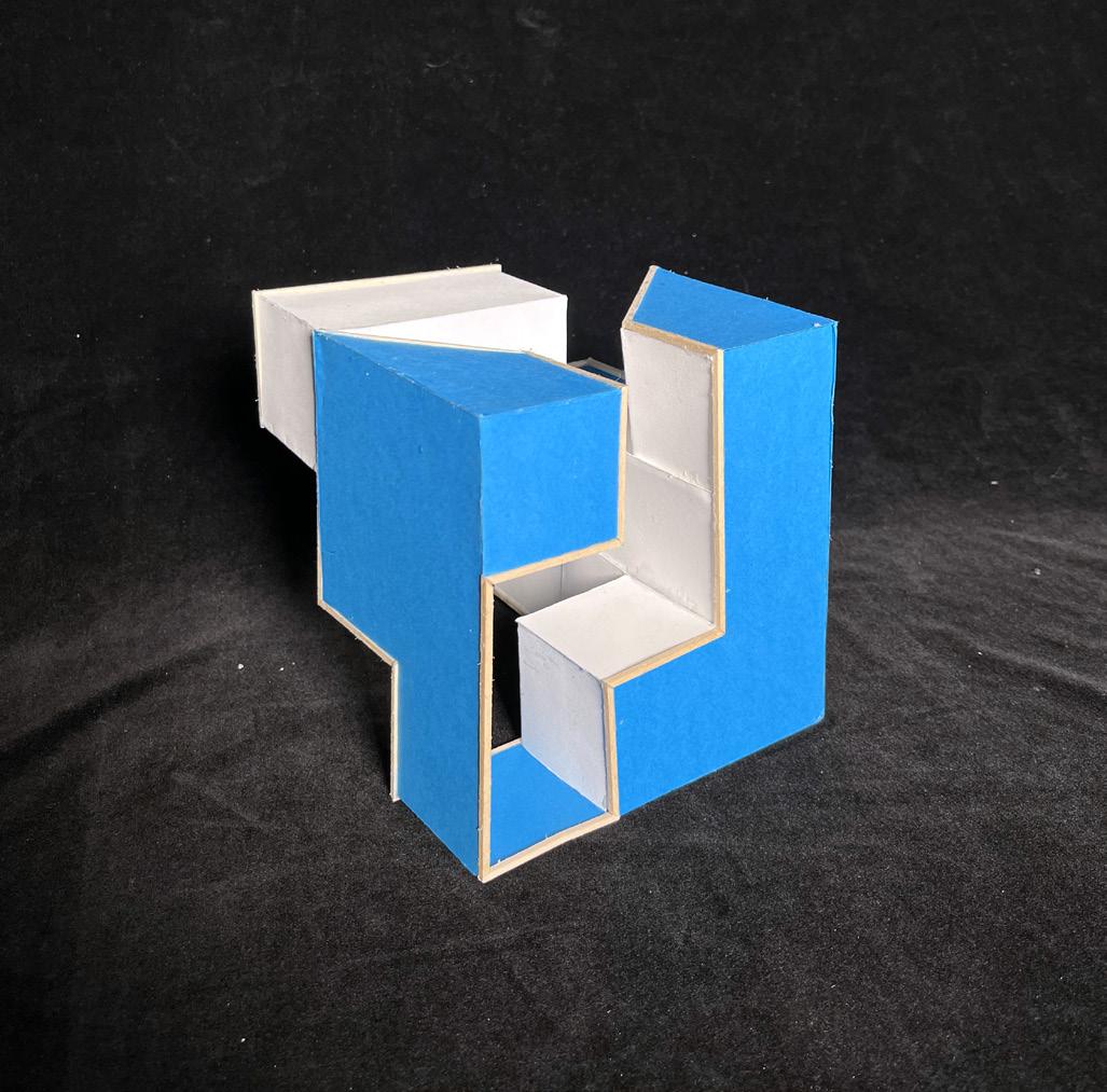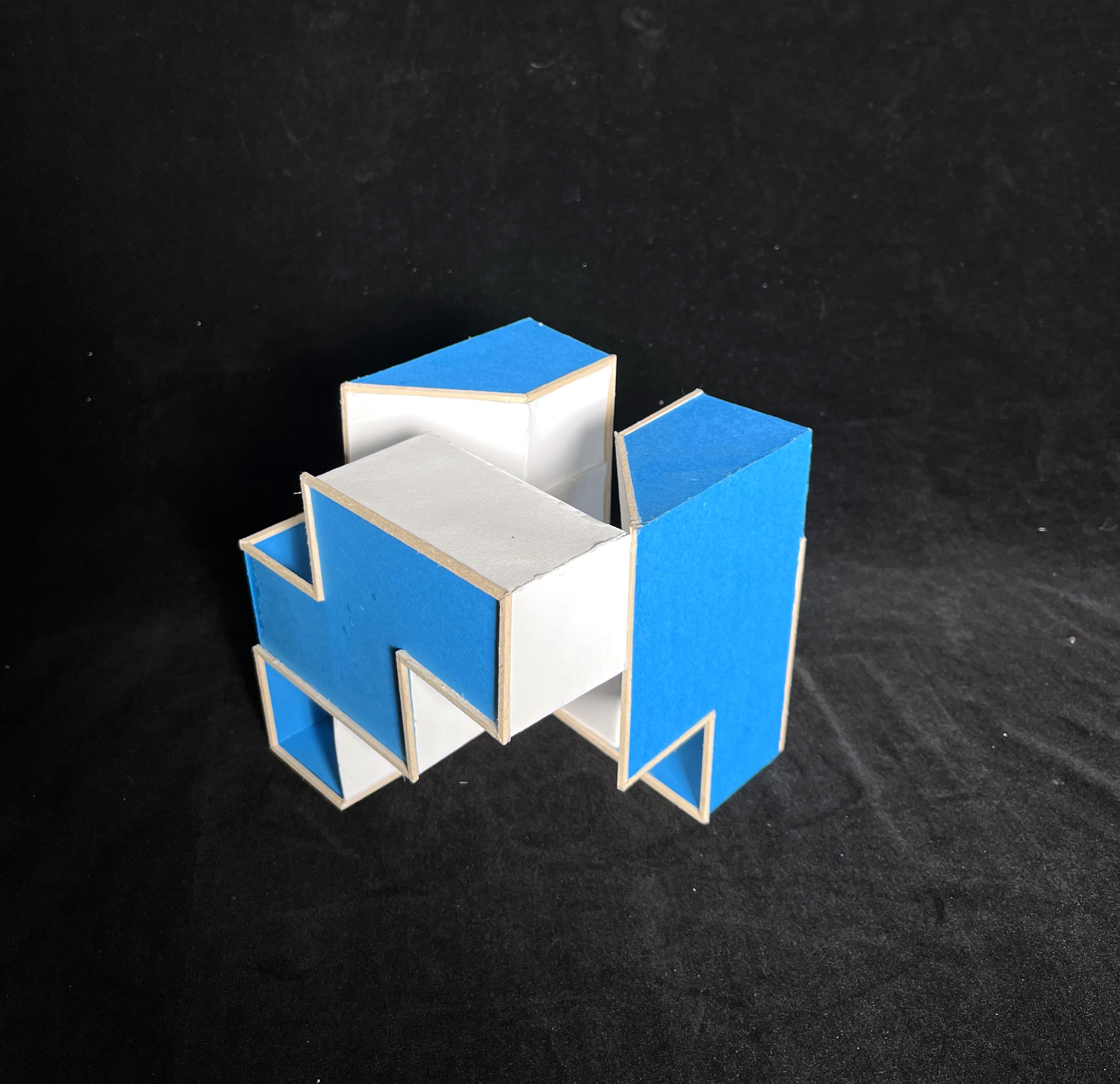 An unrolled cubic plan (far left) was created based on a continuous line across the cube’s sides, and it began an exploration into symmetries, as seen in the Y-shape and two zig-zagged “dead ends.” When portions of the cubic surface were removed and a physical model of the cube was built using basswood and colored paper, additional planes were also designed and modeled. The final model experiments with both shallow voids and dominant, extending voids, and it preserves the elements of symmetry that the unrolled plan began to indicate.
