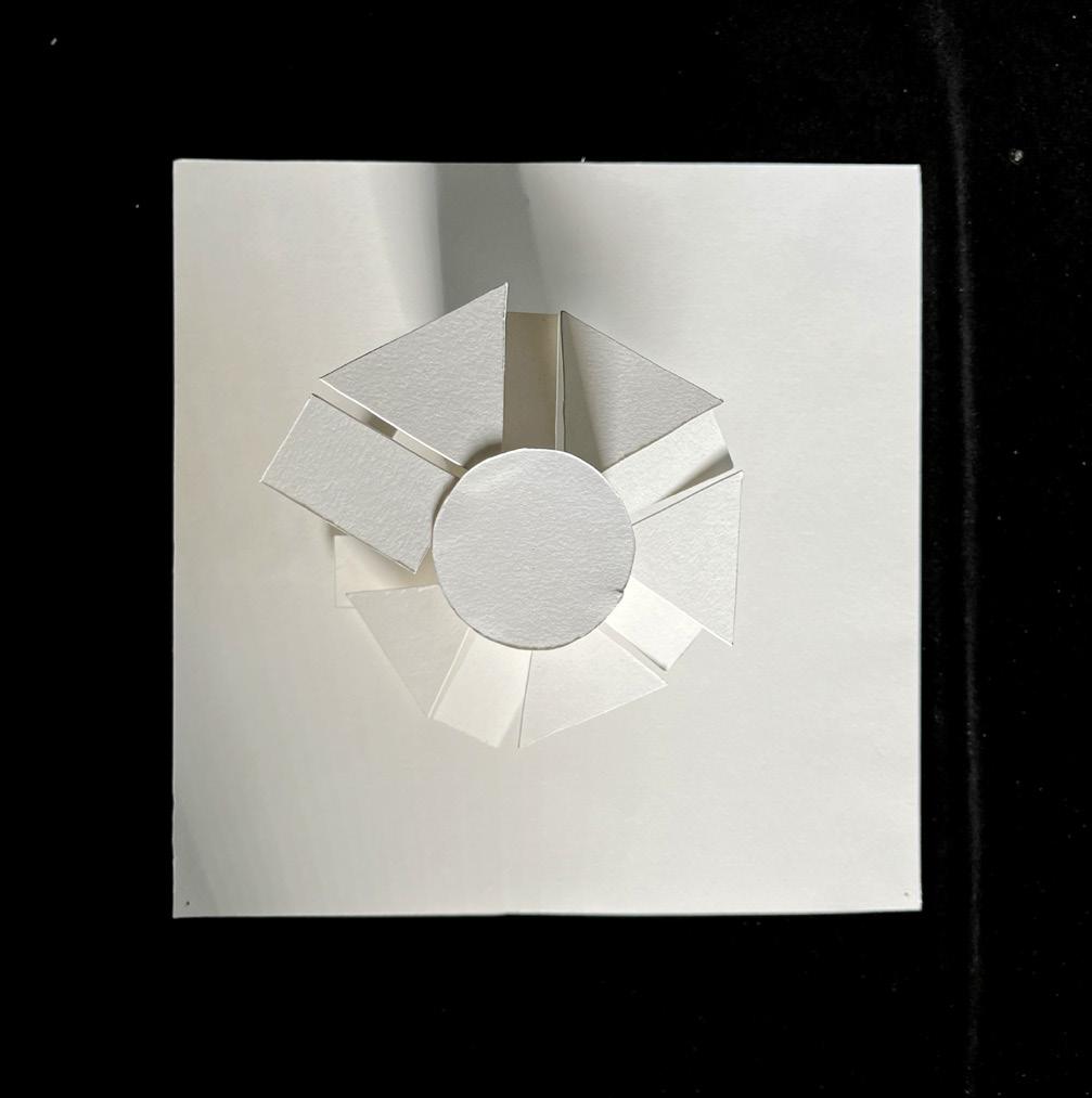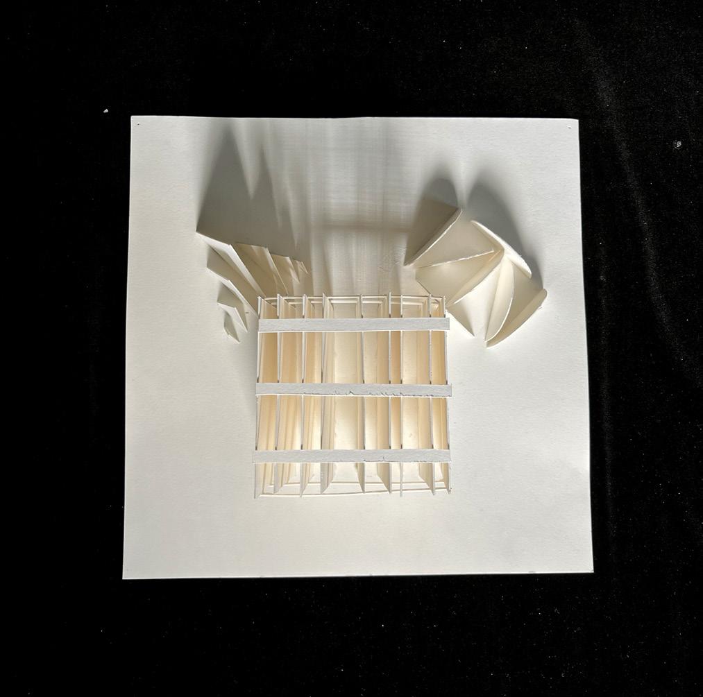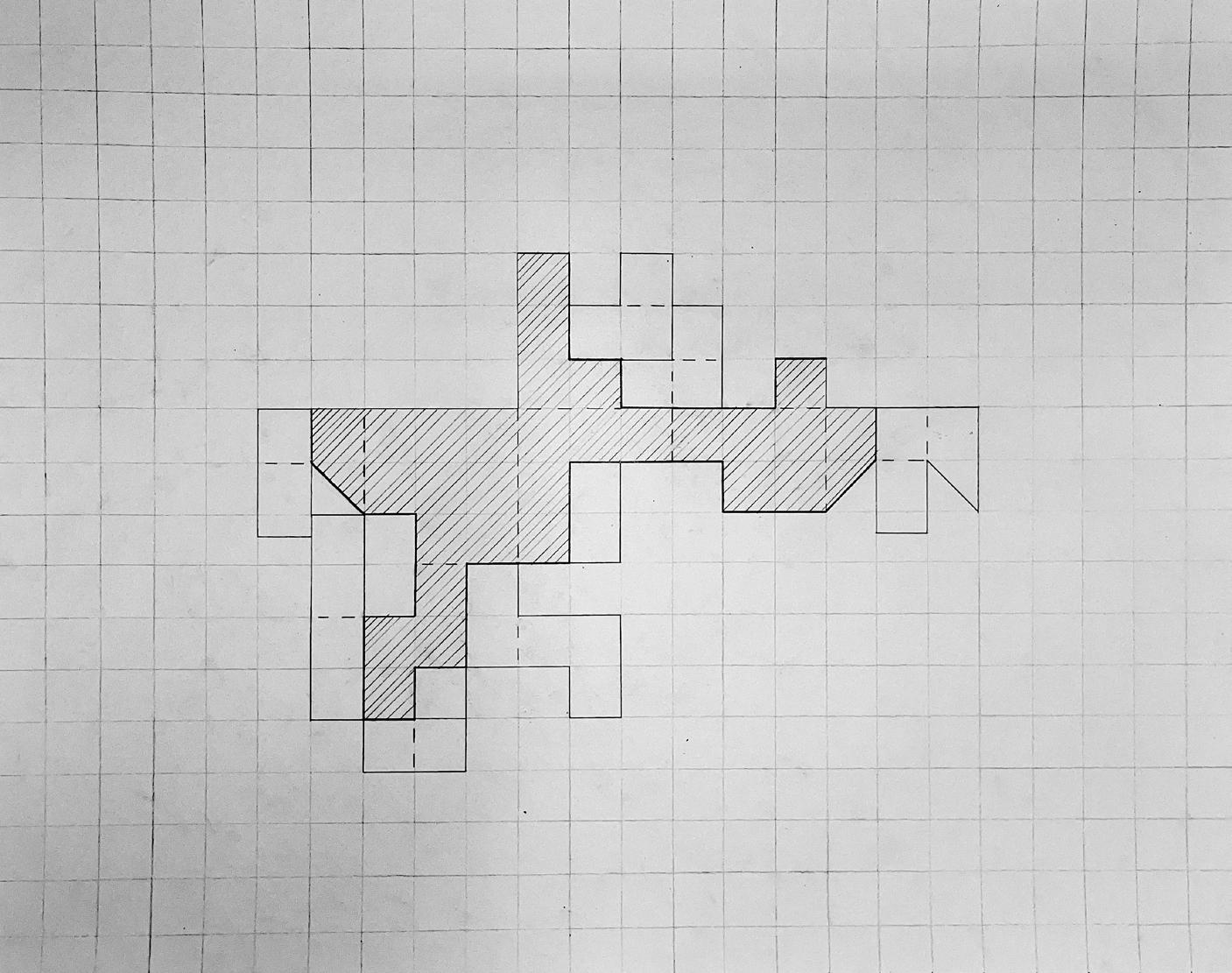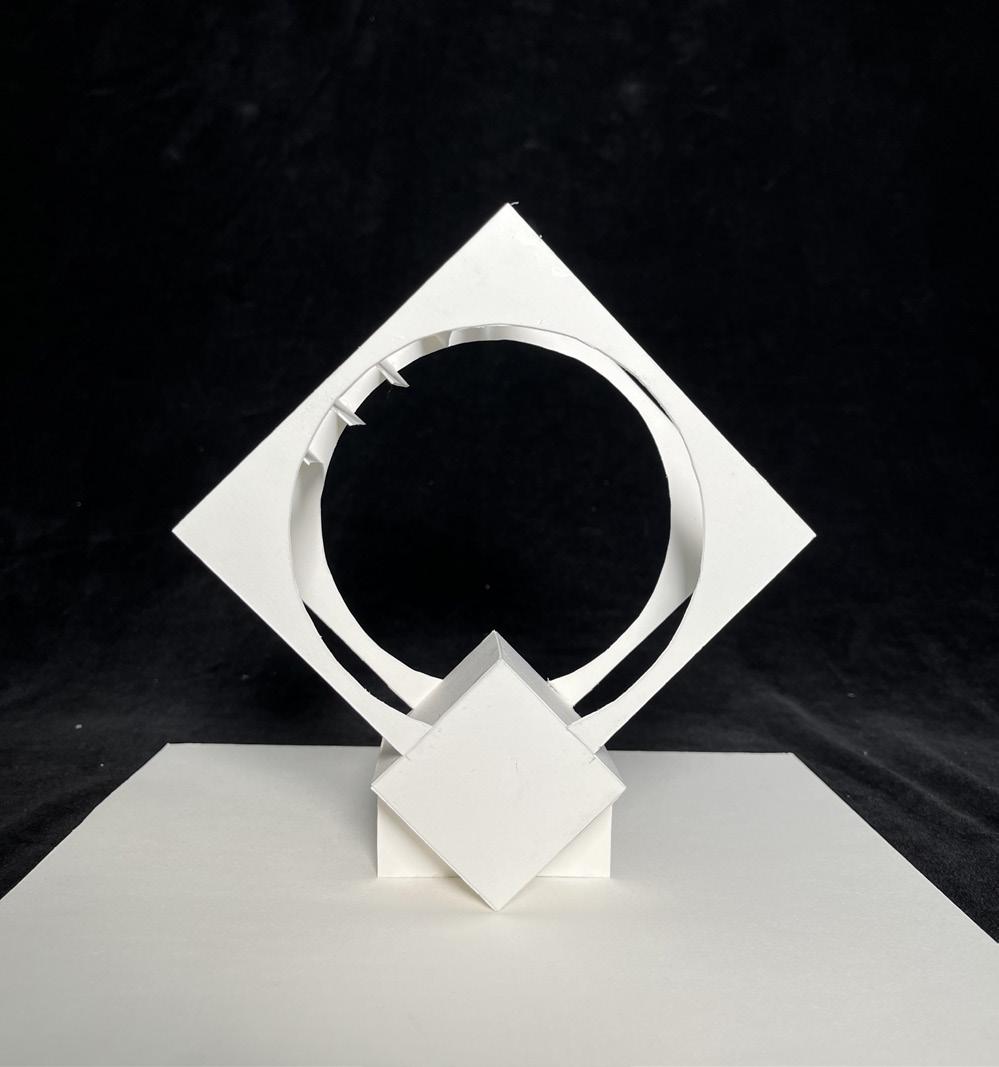An unrolled cubic plan (far left) was created based on a continuous line across the cube’s sides, and it began an exploration into symmetries, as seen in the Y-shape and two zig-zagged “dead ends.” When portions of the cubic surface were removed and a physical model of the cube was built using basswood and colored paper, additional planes were also designed and modeled. The final model experiments with both shallow voids and dominant, extending voids, and it preserves the elements of symmetry that the unrolled plan began to indicate.