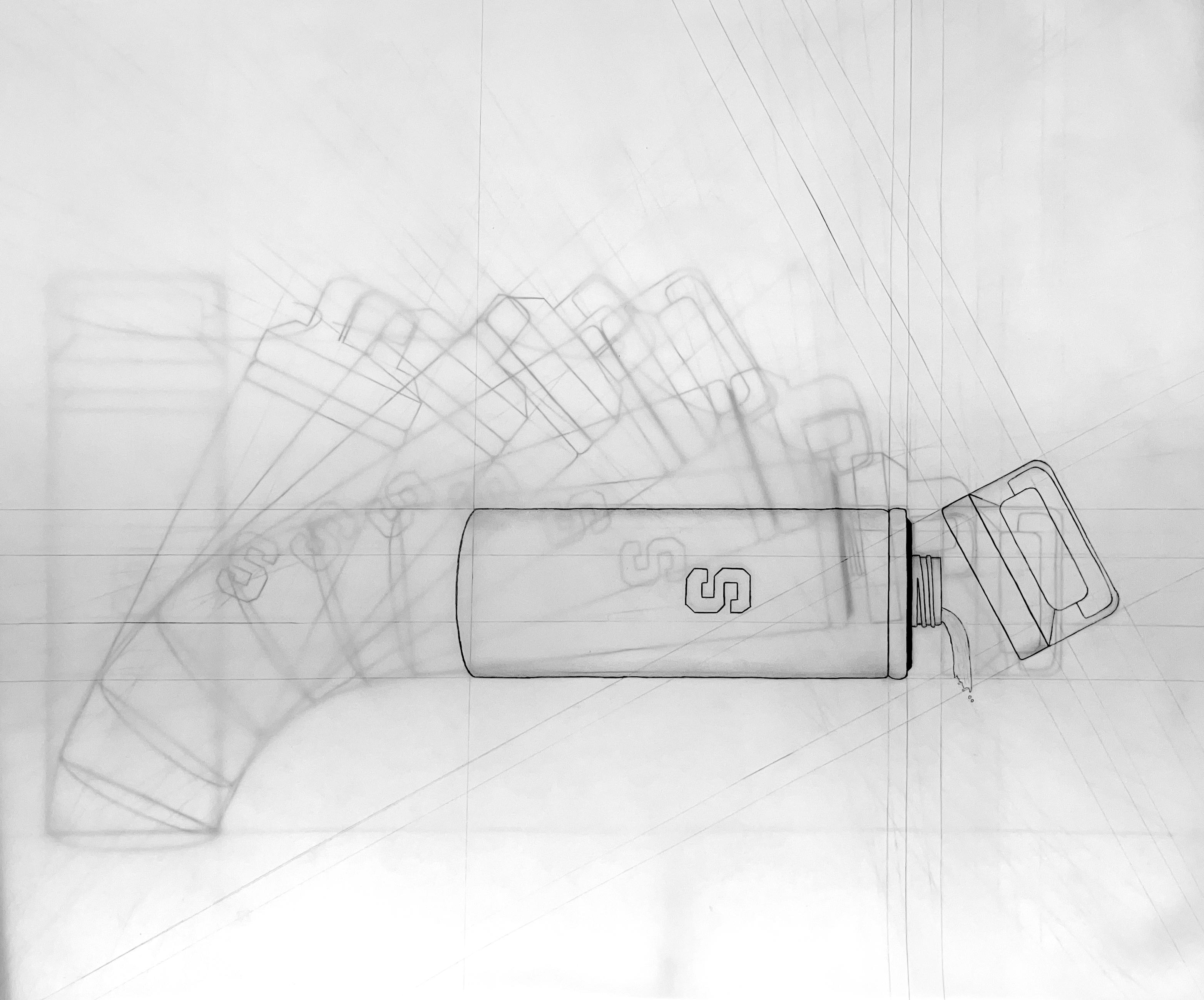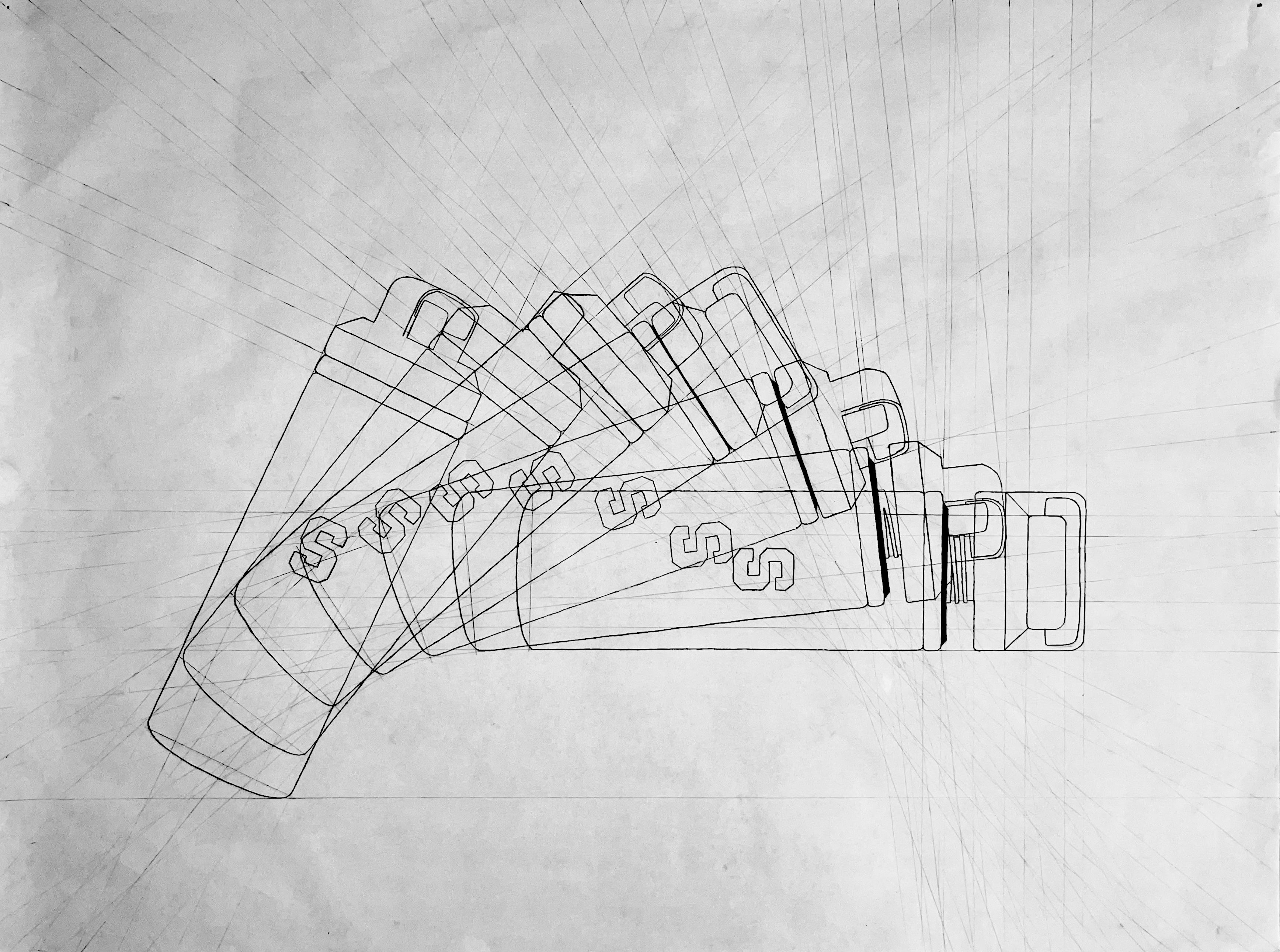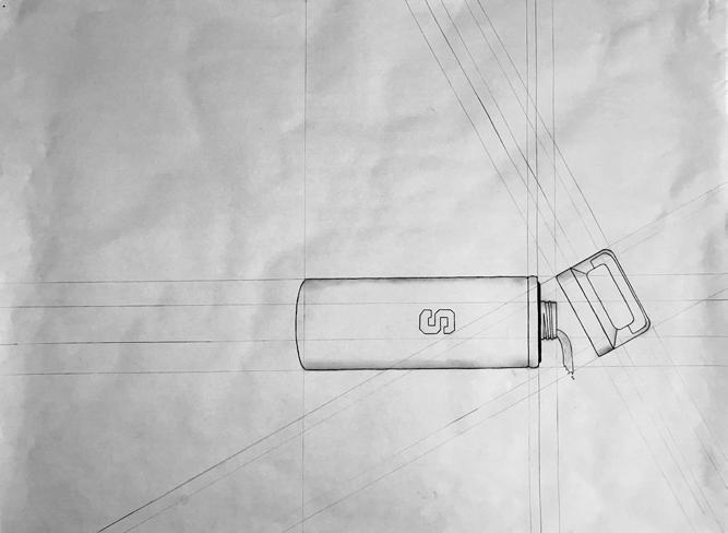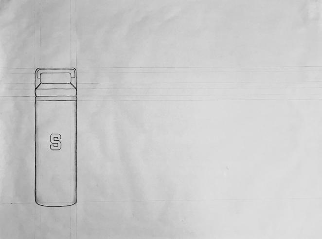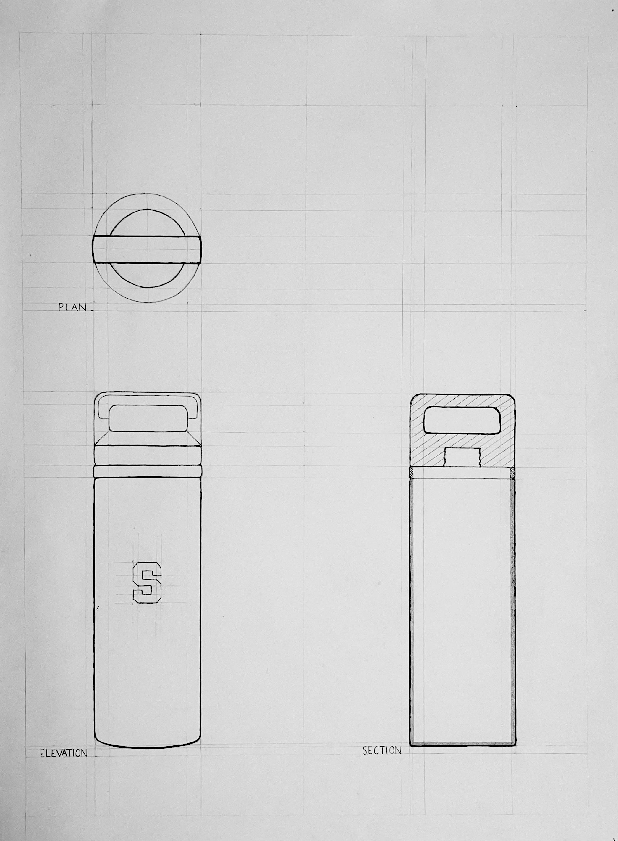 Animation is an inherent part of the functional logic of the water bottle depicted on this page and the following page. After analyzing this object in plan, elevation, and section, an animated drawing of the water bottle being lifted and its lid being unscrewed was created using four distinct layers of vellum.