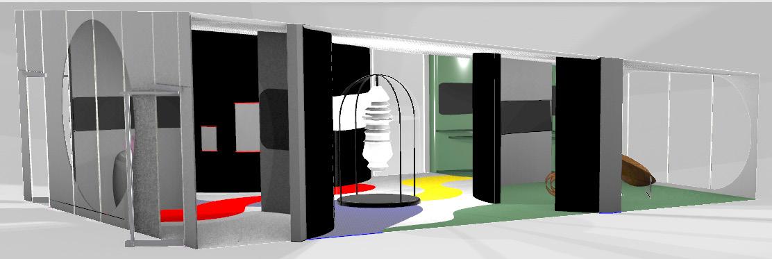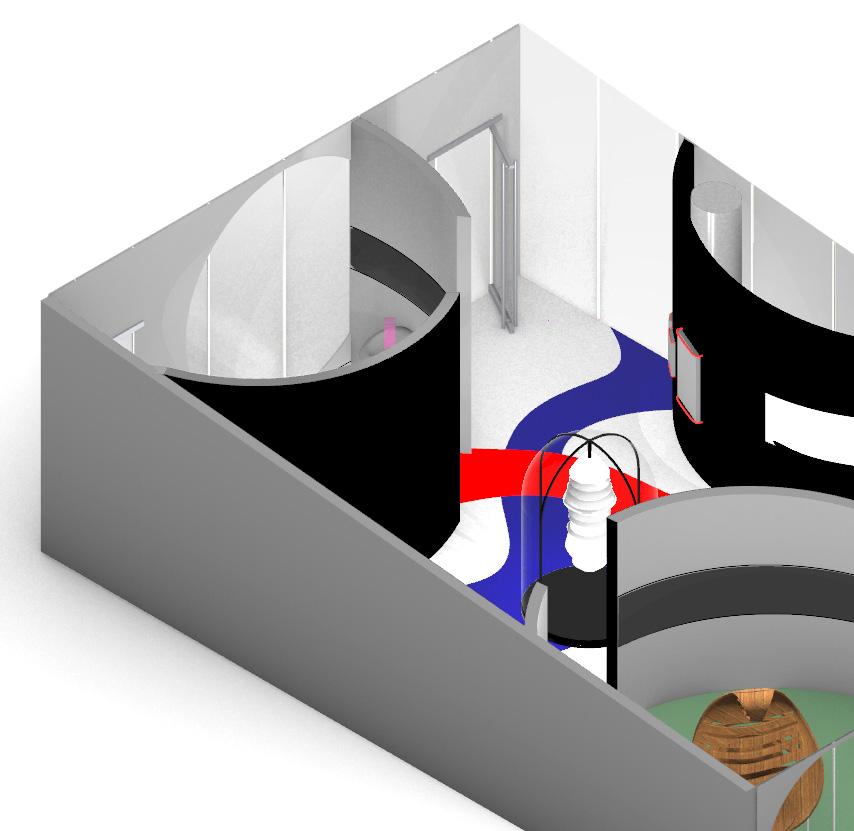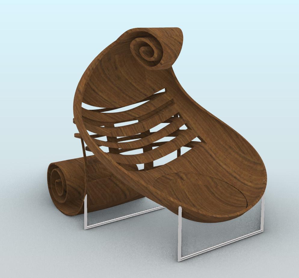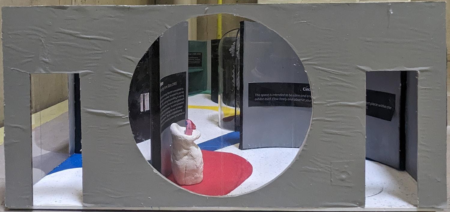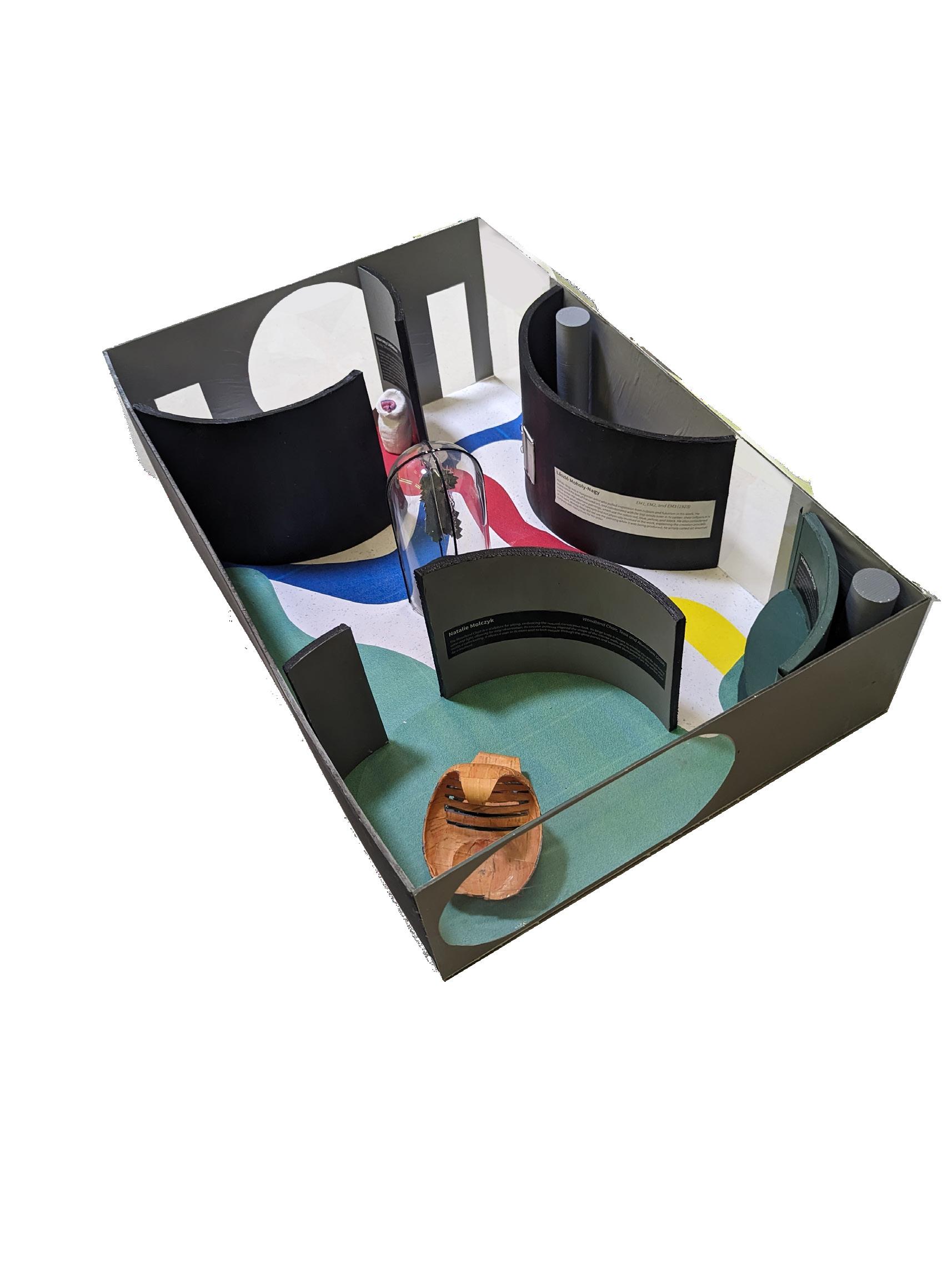 Utilizing the base model of the critique box, I was challenged to transform the space into an art musem featuring five unique items, with one of them being a previous project requiring me to design seating for two postures. Taking inspiration from my “Woodland Chair”, I incorporated circular shapes as a design feature. This space is intended to be calm and energizing, incorporating aspects of each art piece within the exhibit itself. Visitors are encouraged to flow freely and observe their surroundings while moving throughout the open space.