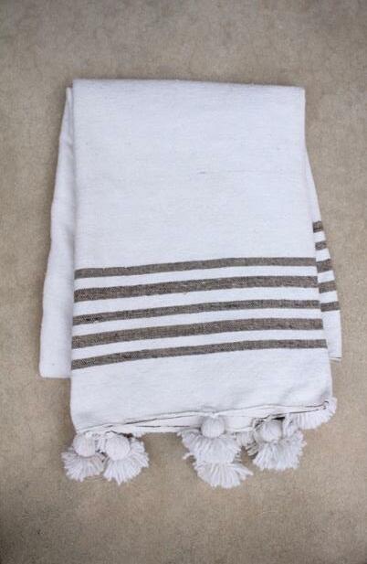 Handwoven cotton. White with 5 black stripe & black poms 60x96”