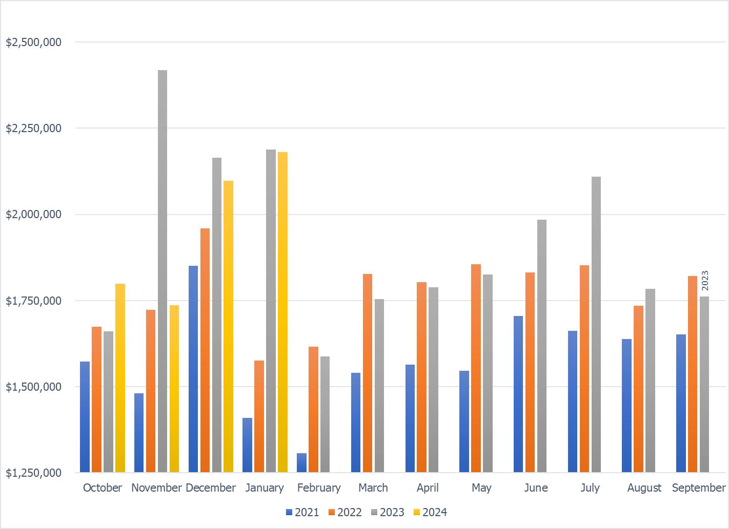 Property Taxes collected as of January 2024 were $52,076,247 (up $4,687,651 or 9.9%) compared to $47,388,596 in the prior fiscal year for the same four months.