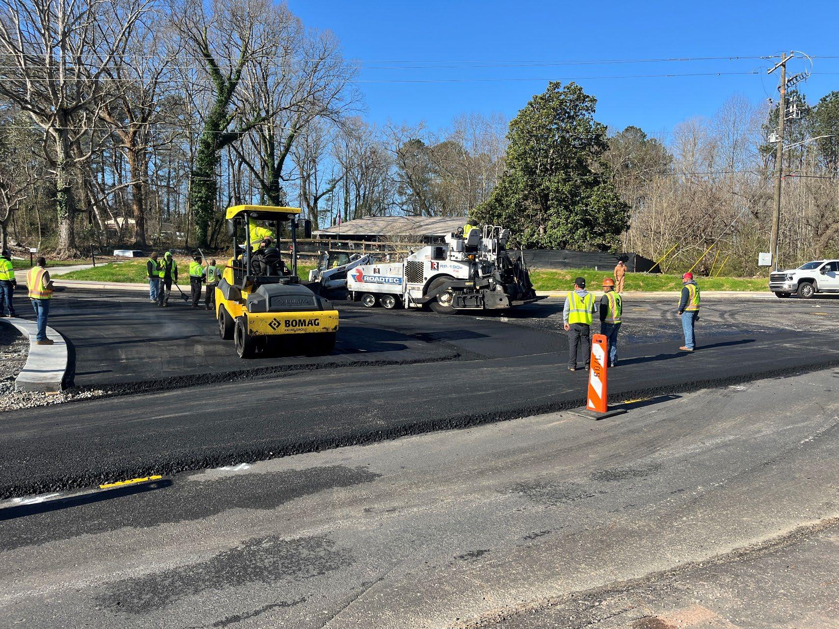 Triple R Paving on-site placing asphalt (leveling) along Butner Road and Union Road