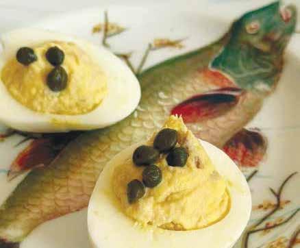 2. Slice the eggs in half lengthwise. Remove the yolks and add them to the tuna mixture, pulsing until smooth. Place the egg whites, hollow centers up, on a serving plate.