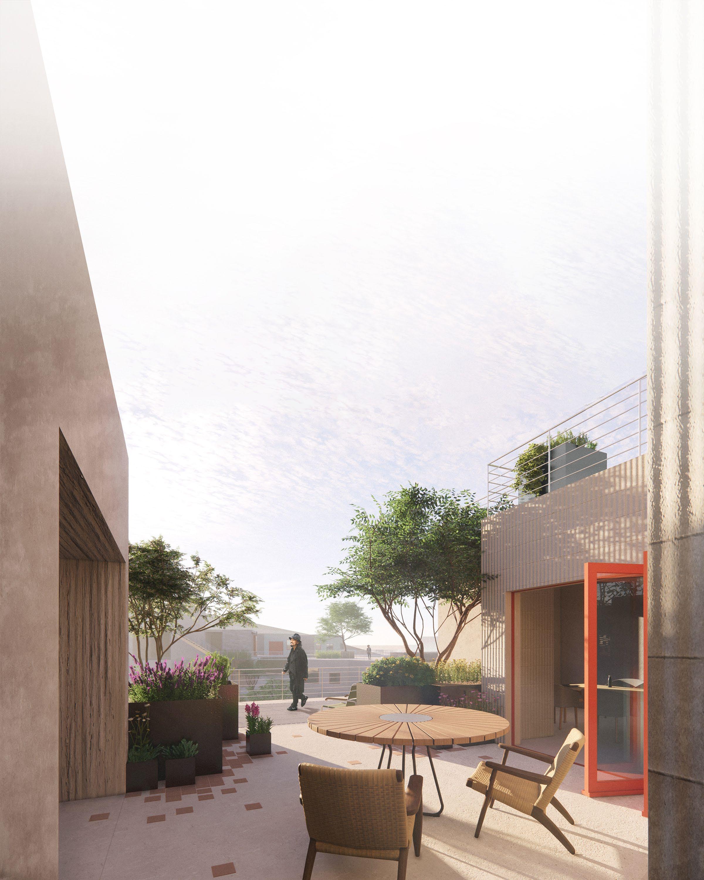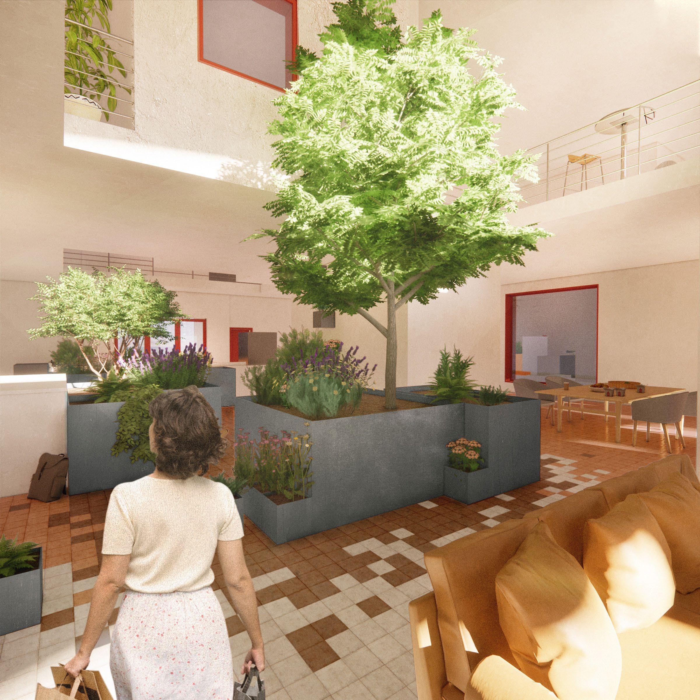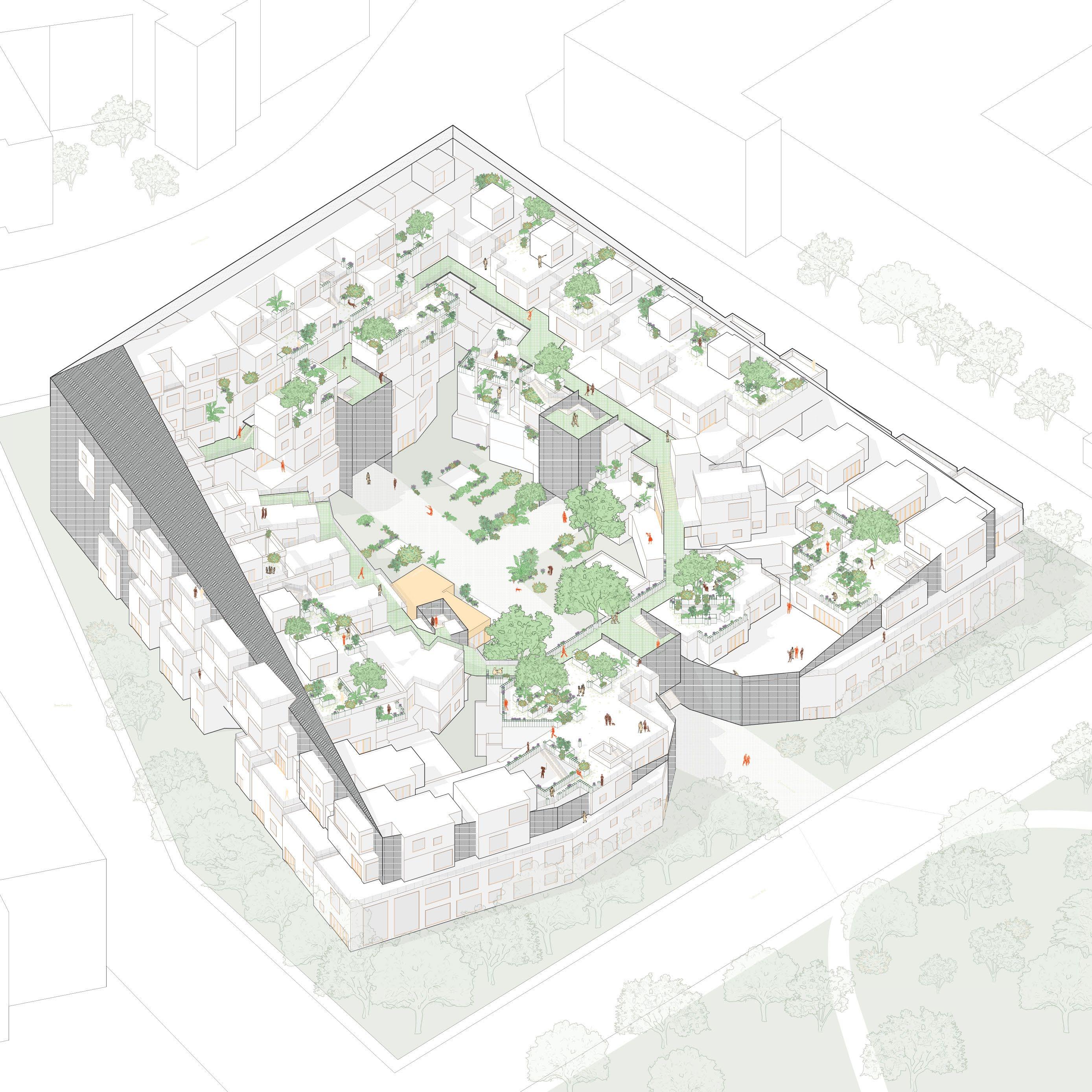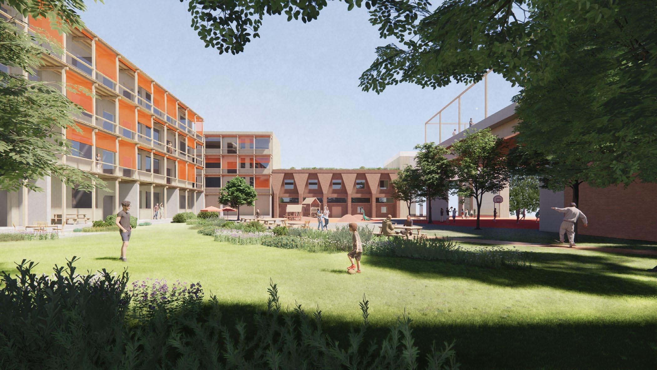 Interior courtyard of a large block, featuring apartments, a daycare, and rec center