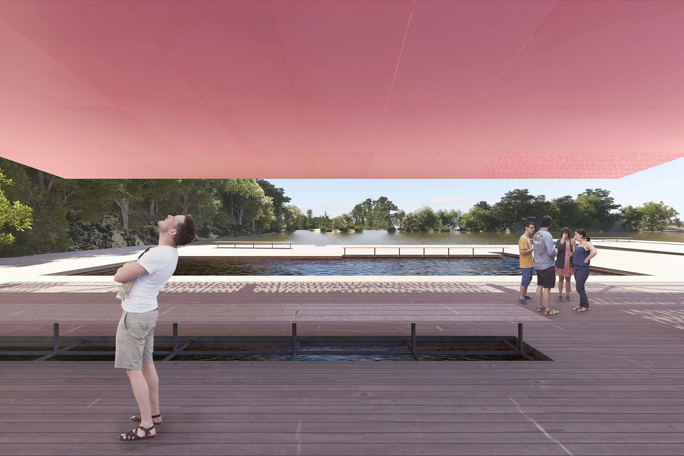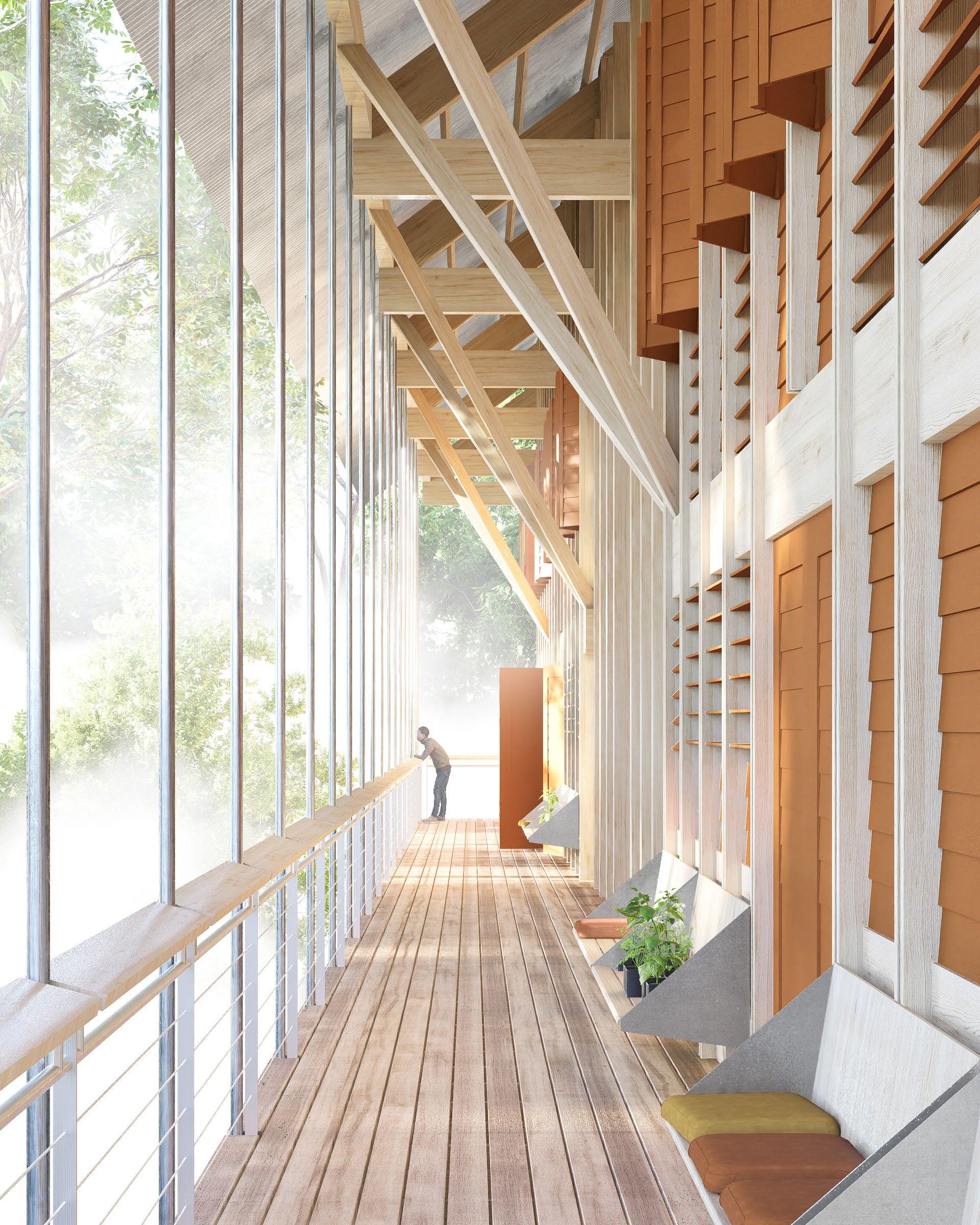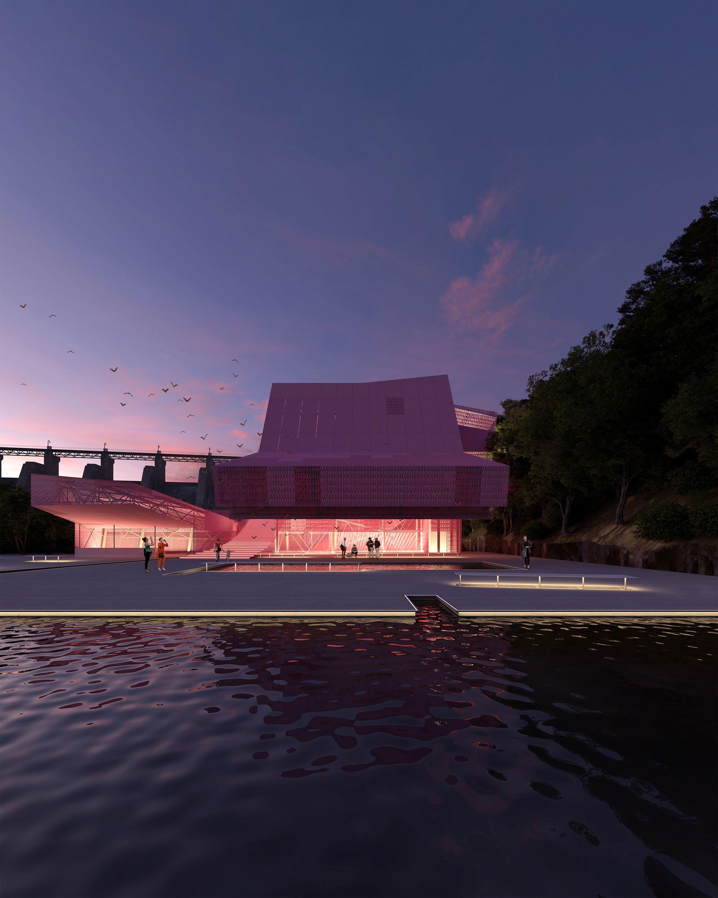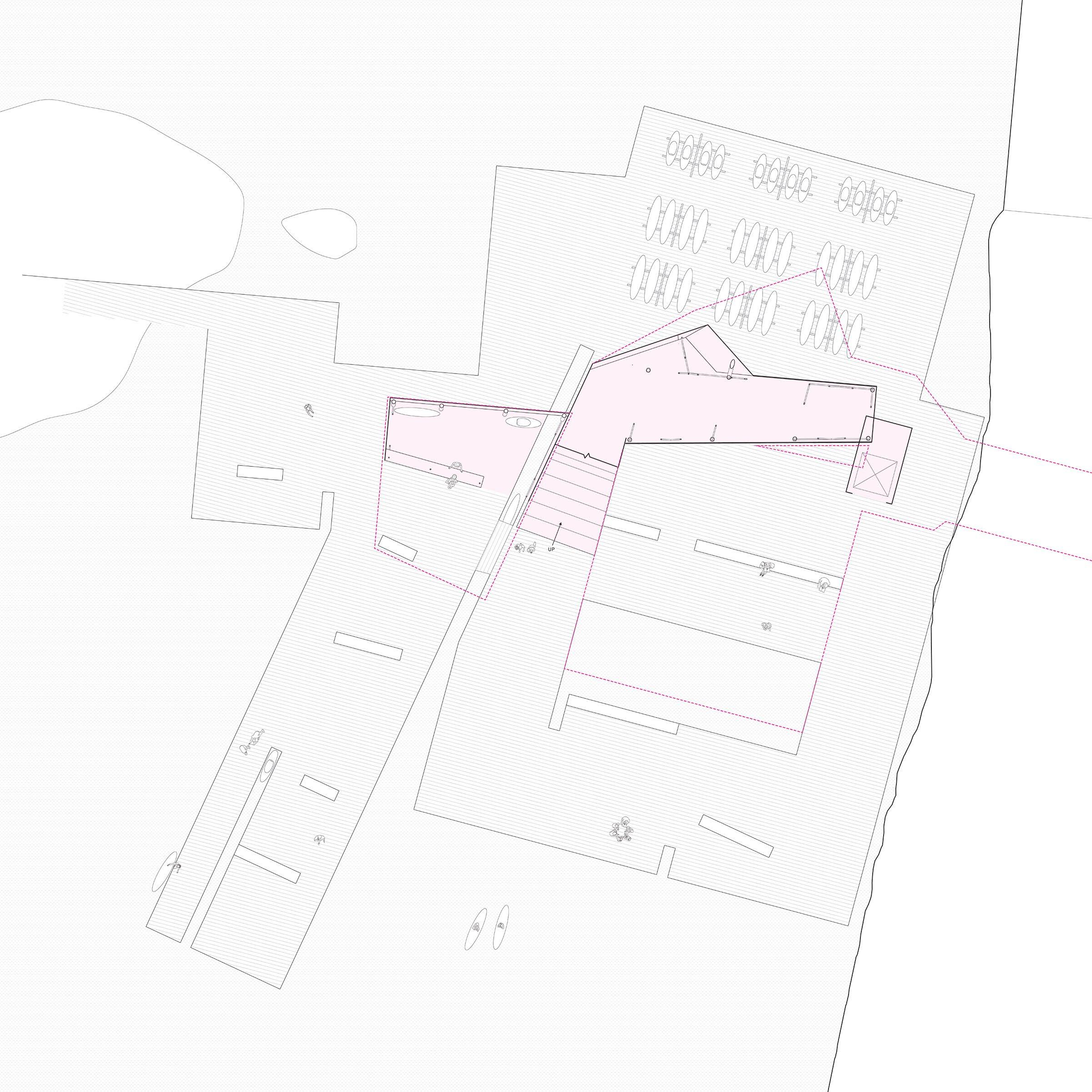 As a bat roosting site and kayak rental facility, this project puts non-human users first. Through flight and roosting, bats experience the world very three-dimensionally, while boats only experience the planar surface of the water. These experiences lead to a complex volumetric shape for hosting bats lifted above a simple, flat deck for launching kayaks. People circulate between volume and plane, with space to view the dam, the surrounding landscape, and the exit of the bats on their nightly flight. The intervention also serves as a landmark that signals the end of Lady Bird Lake and completes the riverside walking trail.