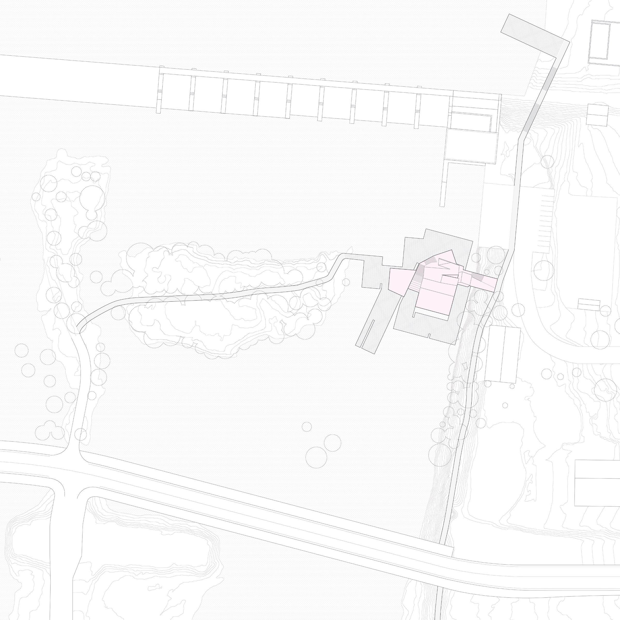 Site plan: building located between dam and bridge, riverbank and isle