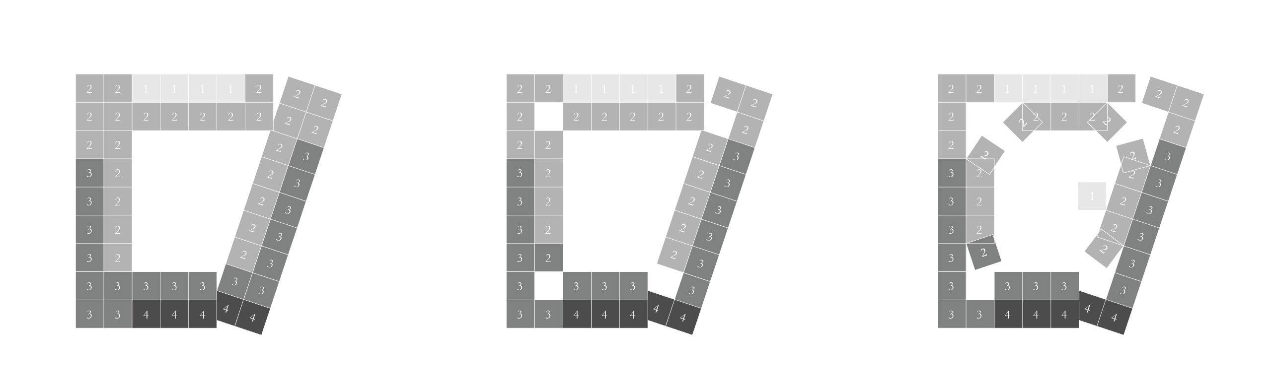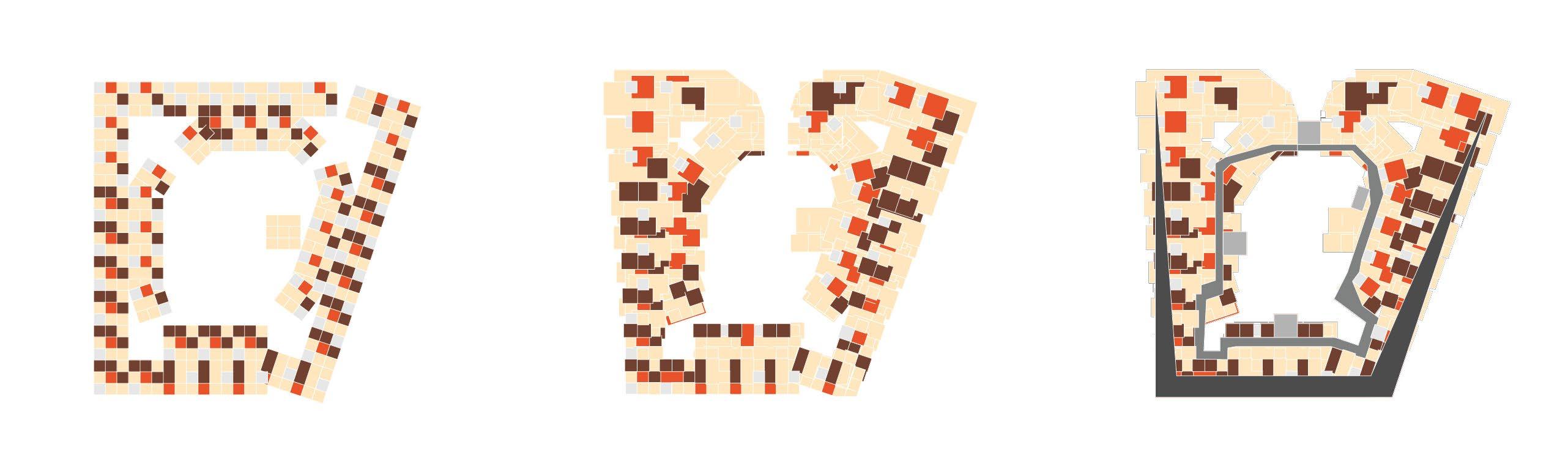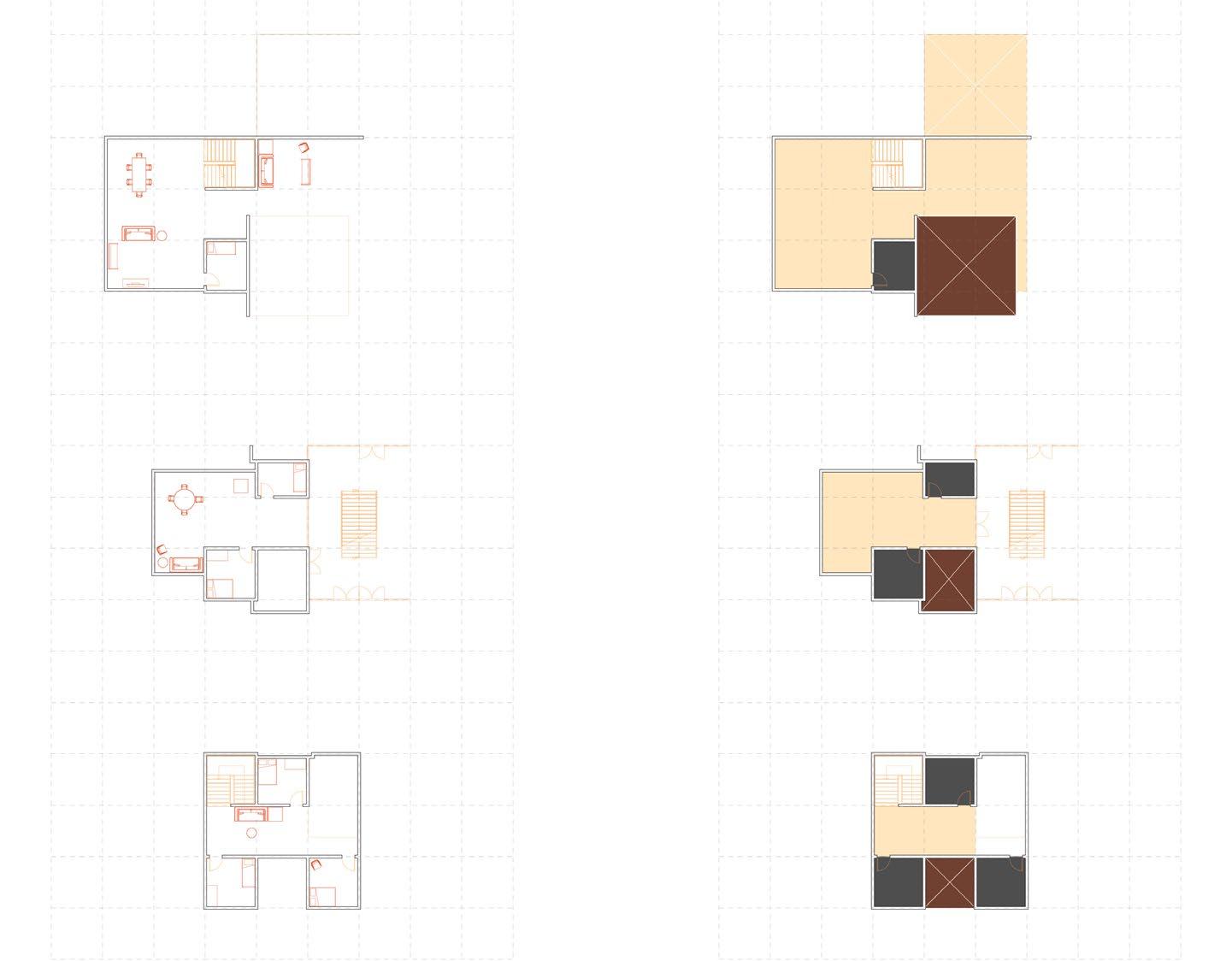 This project focused on unit aggregation strategies for a housing block in southeast Austin. At the unit scale, public rooms (living, kitchen, garden) expand as the units approach the river and park to the North, taking over space previously allotted for private spaces. This strategy offers residents a range of shared-ness to choose from while making communal living and shared amenities more desirable. All units are tied together by a large central courtyard as well as a roof path that creates a street-like condition (left). Four small courtyards offer a scale between unit and block, forming local enclaves.