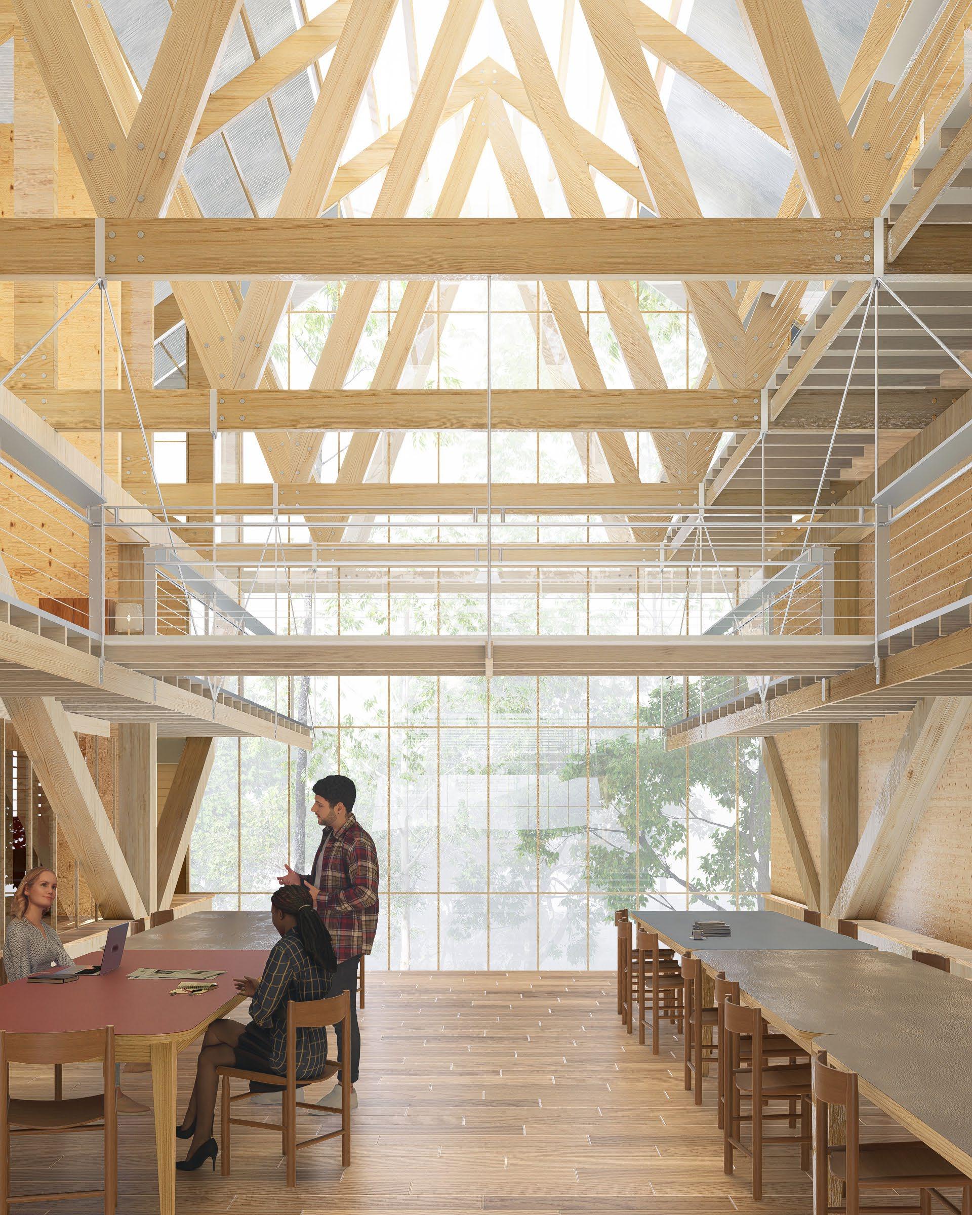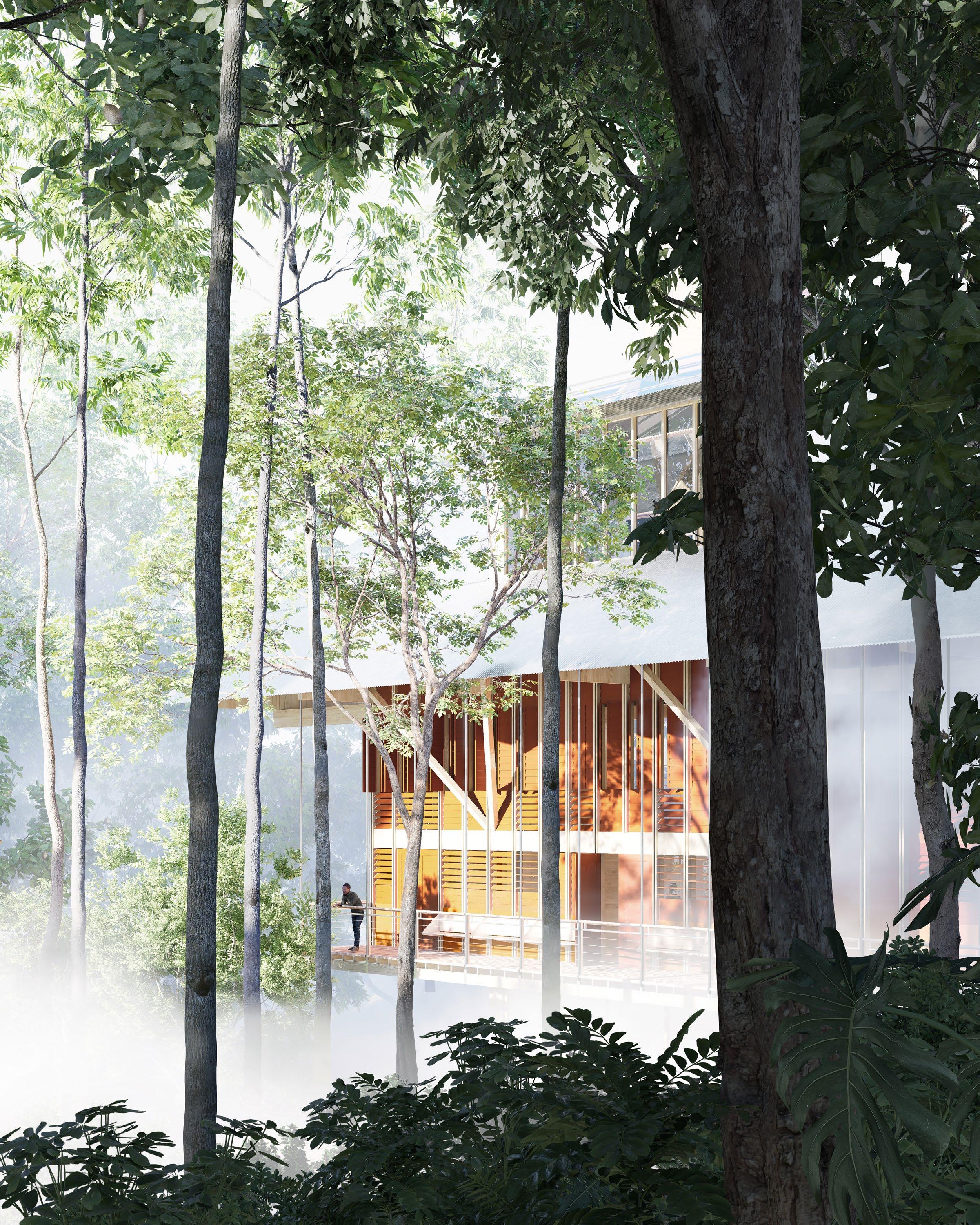 In the dense cloud forest of Ecuador, USFQ requires a new research station for ecological study, equipped with labs, classrooms, observation areas, and more. This project proposes a simple timber building that creates multiple scales of space relevant to scientific work. Shear walls of the structure rise from the ground, tied together with massive trusses and capped with gabled roof trusses. At the entry level, an open central hall allows for collaborative work and lectures. Smaller study spaces and offices sit between shear walls that flank the hall, reaching up and through the roof. Beyond these rooms, an exterior deck provides a platform for observation and experience of the forest. Labs sit on a concrete slab below the main level, with easy access to the environment.