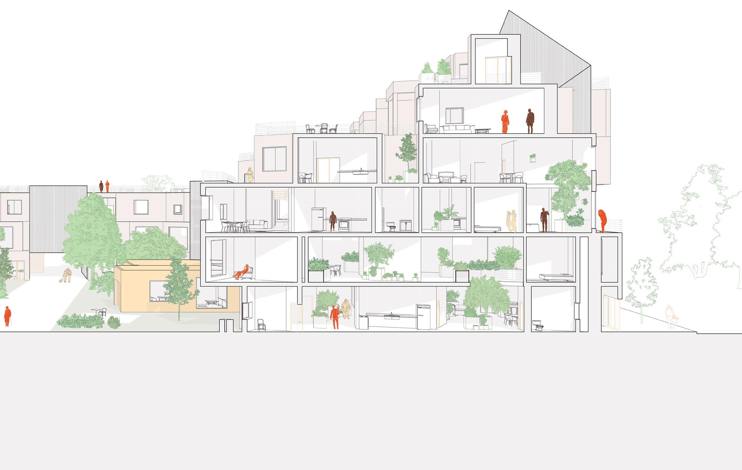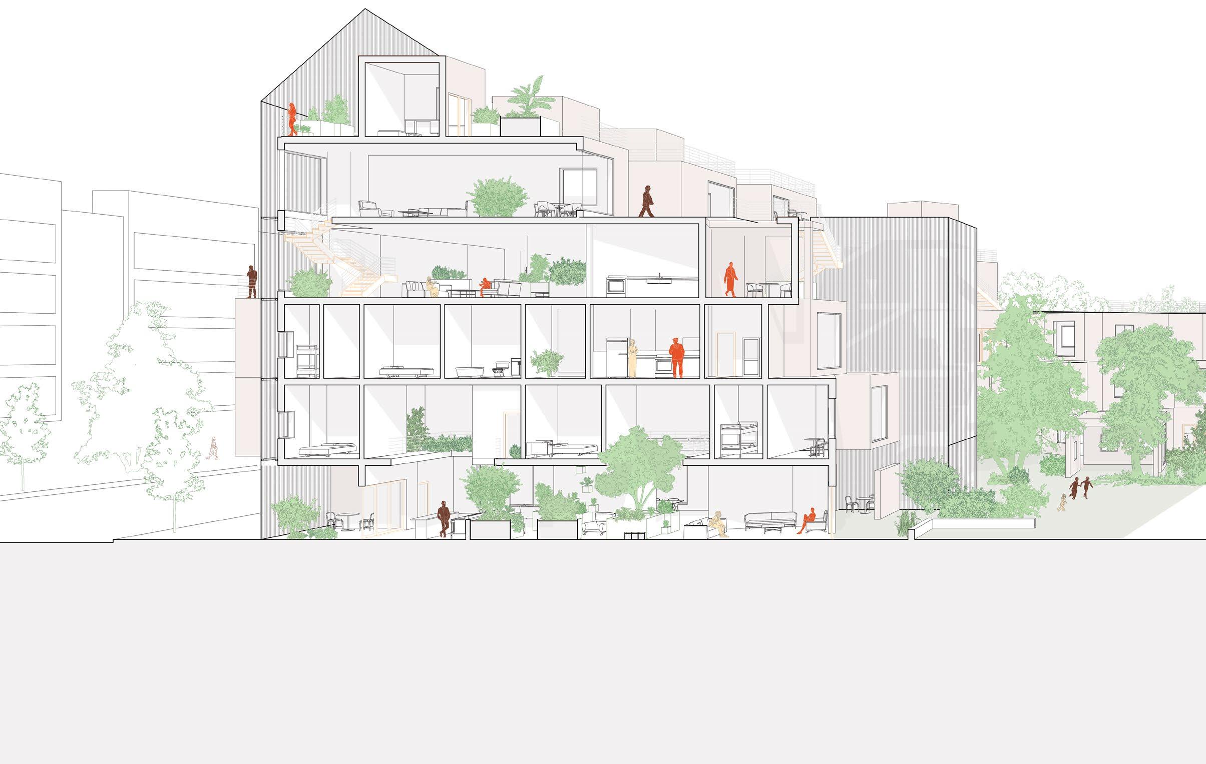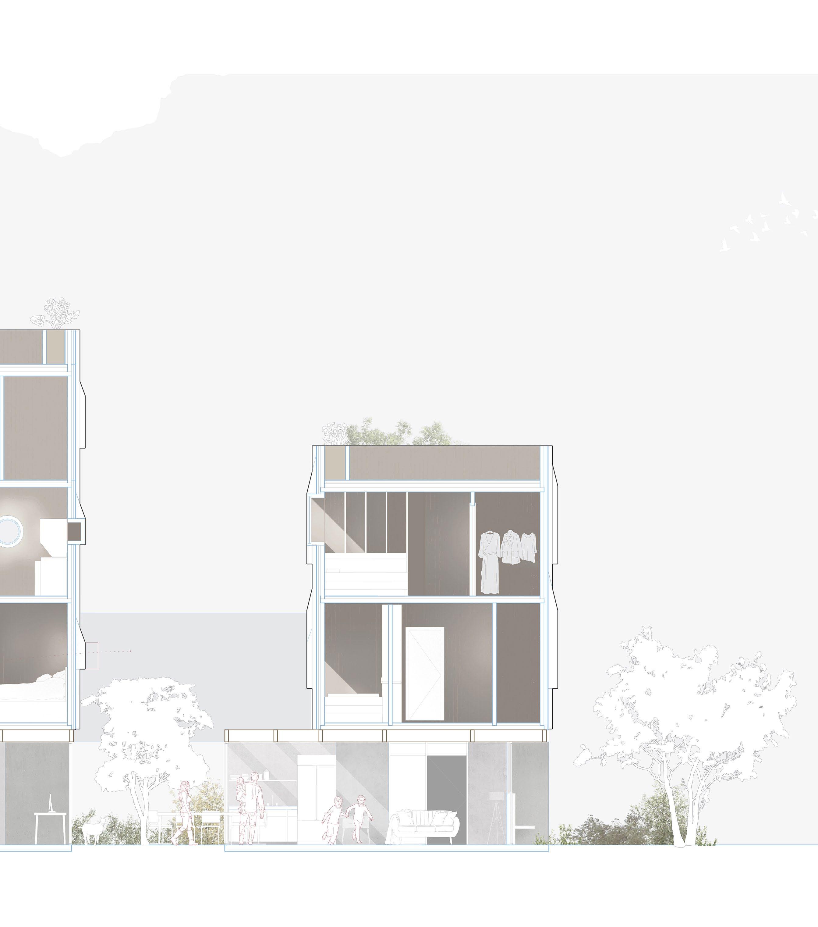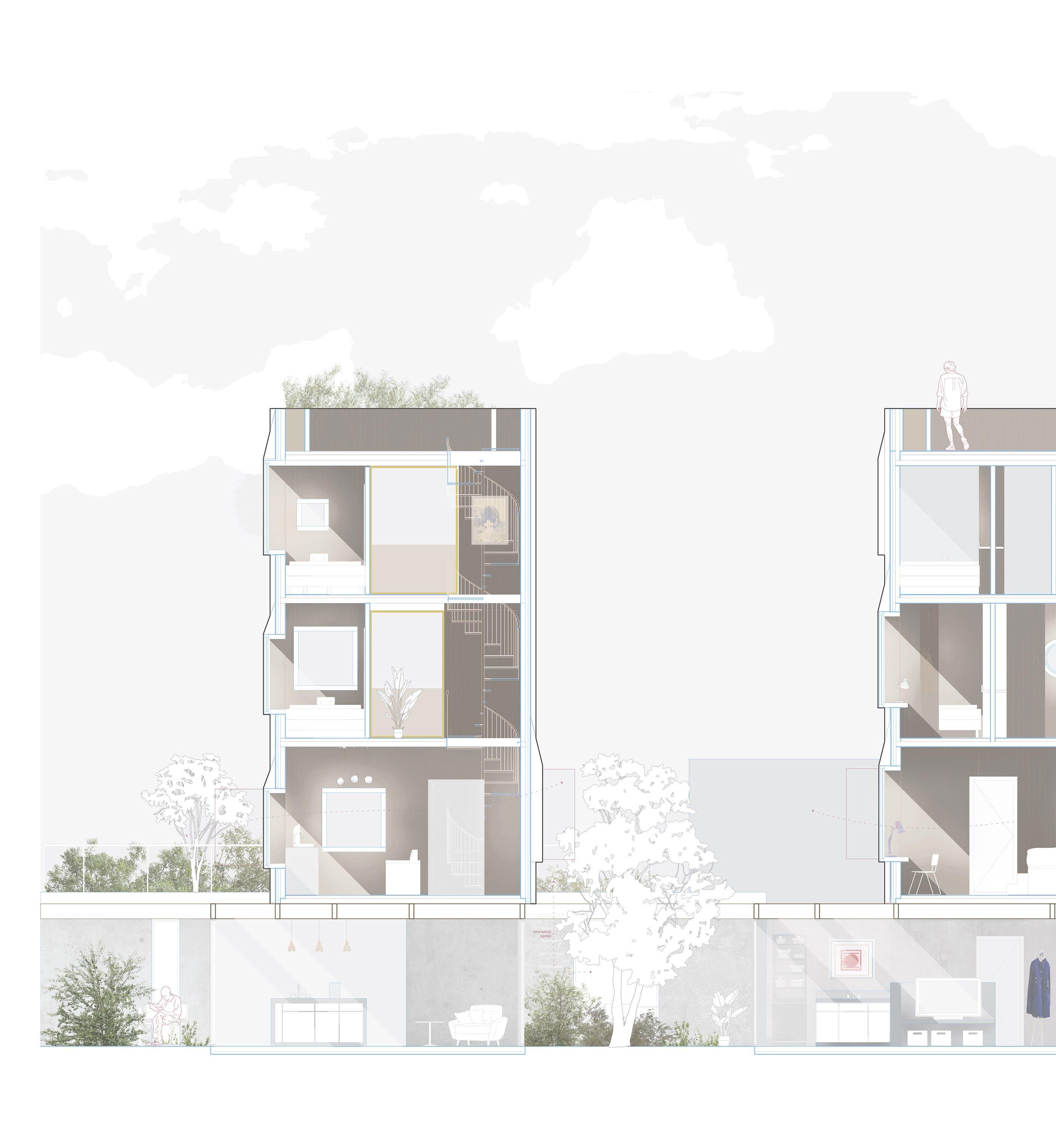 In the extremely expensive housing scene of San Francisco, single family lots need rethinking to become affordable. In this project, a single family lot is reimagined to contain four individual homes with special attention to privacy within density. To provide access to units deep in a narrow lot, the ground level remains fairly open, with concrete masses arranged to define yards and living spaces. Above, small CLT towers enclose private spaces of the homes while allowing light down into the yards. Window placement helps to further negotiate between public and private viewing, while rooftop gardens provide even more outdoor space.