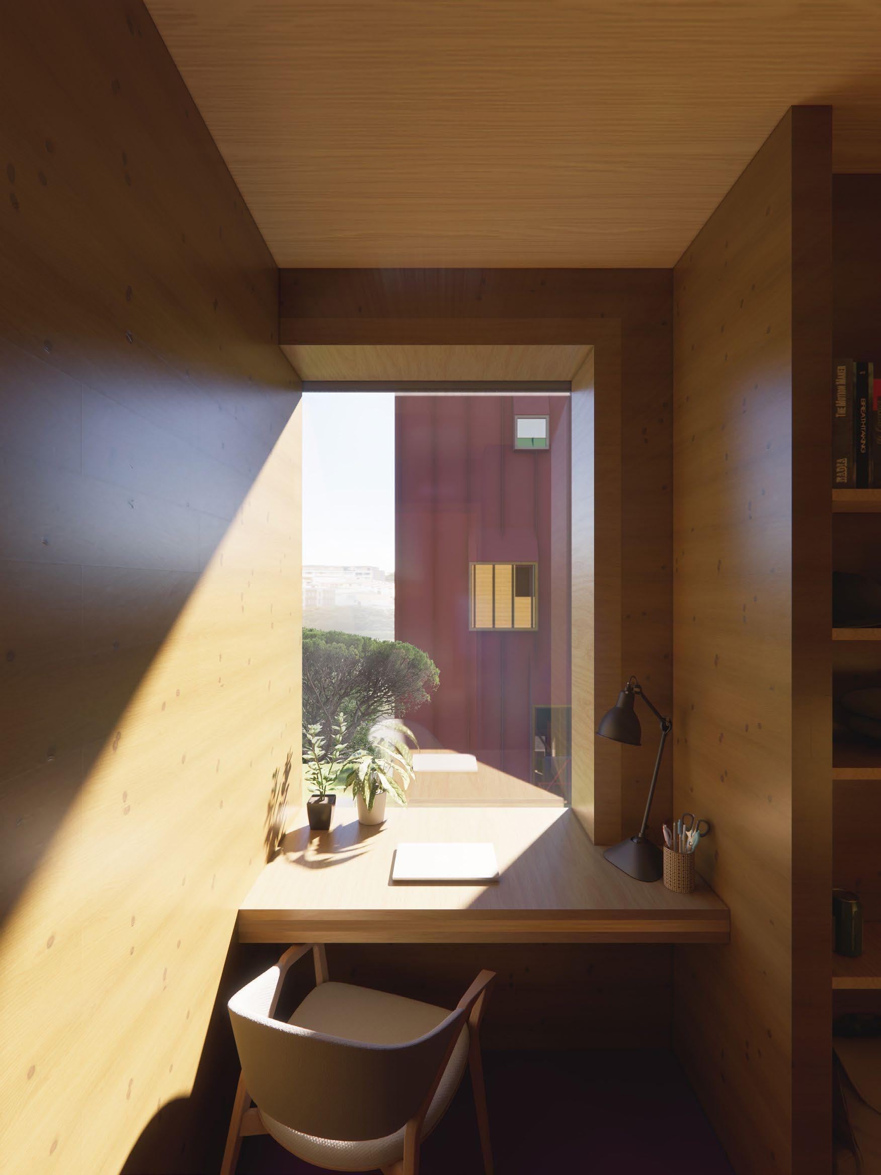 floor, contrasted with warm privacy of wooden boxes above
