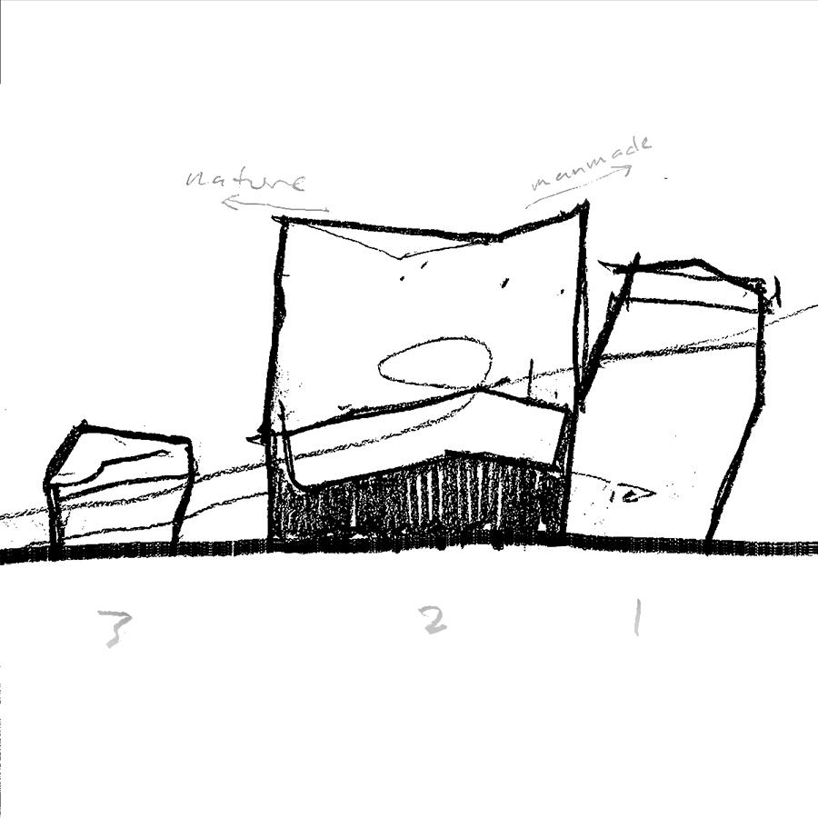 Site plan: science building center, dining hall to the South, observation tower and residence hall to the North