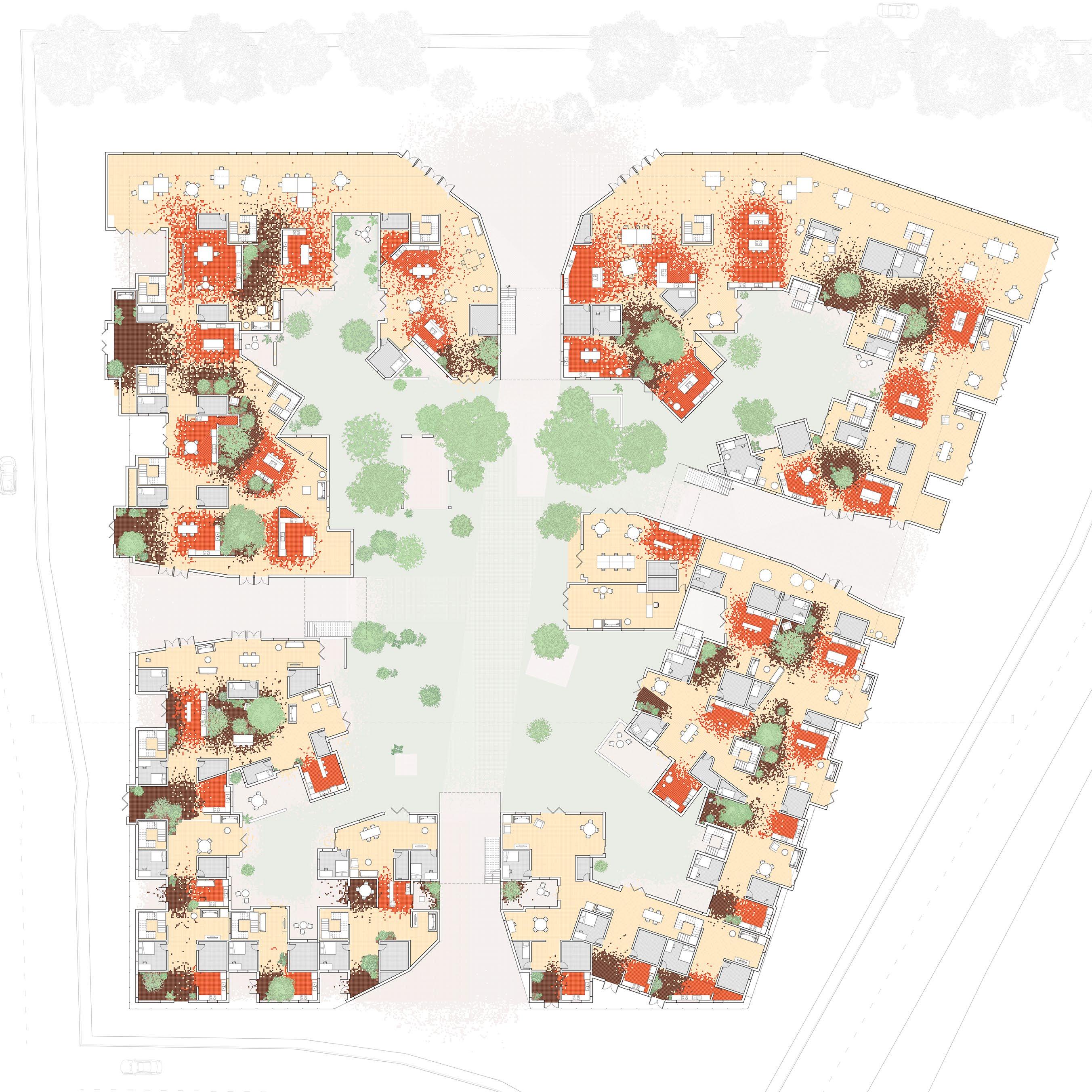 Ground floor plan: color indicates expansion of public space (kitchens, gardens, living rooms)