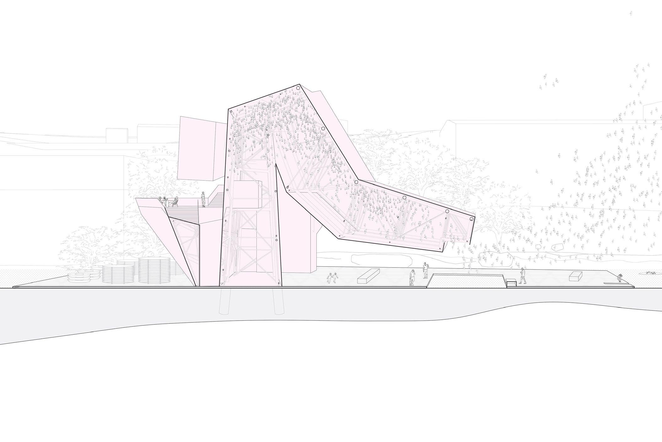 Transverse section: bats roosting inside fly out over viewing deck