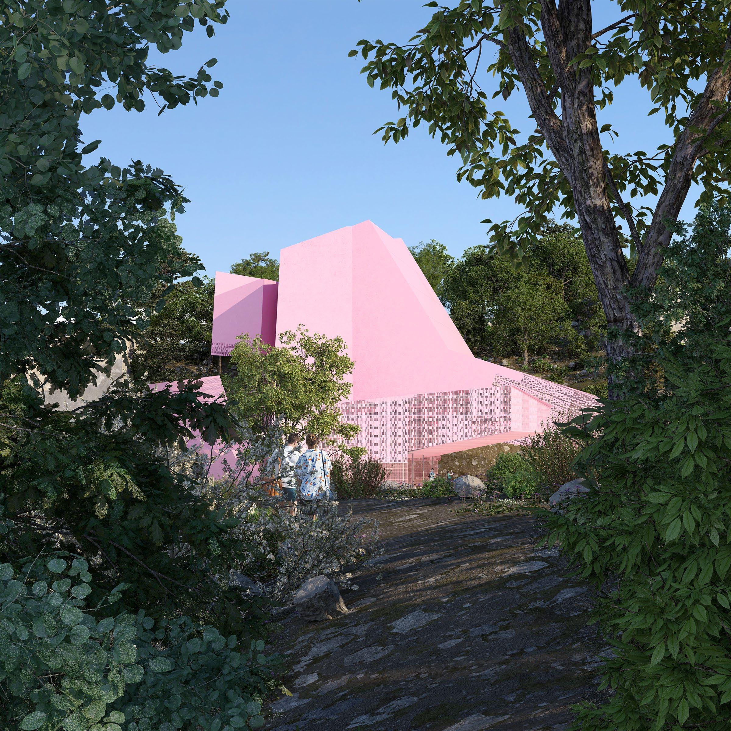 Axonometric view: swelling public spaces push through mesh wrapper