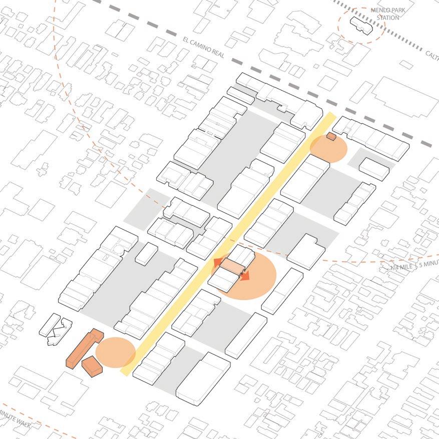Like many Silicon Valley towns, Menlo Park suffers from a lack of housing and density. This project looked to combat this issue with new public spaces, housing infill, and a connective loop. The public space phase increased the walkability of Main Street by eliminating a car lane, increasing green space, and adding seating areas to enlarged sidewalks. The street connects three new nodes: an amphitheater, a market and play area, and community art spaces. Next, courtyard blocks with mixed-use functions provide dense housing with private exterior space in former strip parking lots. Lastly, new retail fronts and planting create a lively alley loop connecting new housing to plazas and the existing main street.